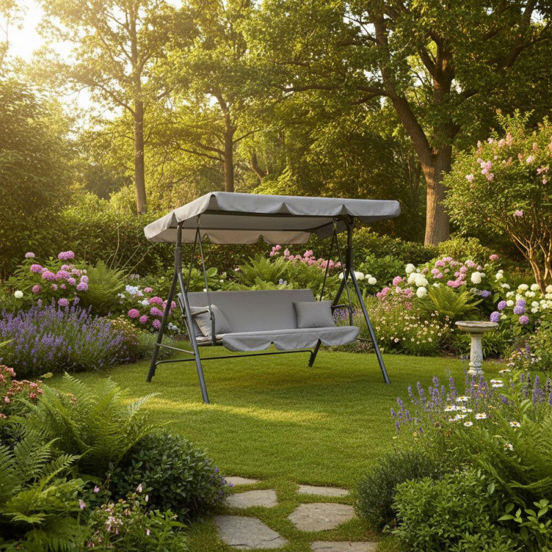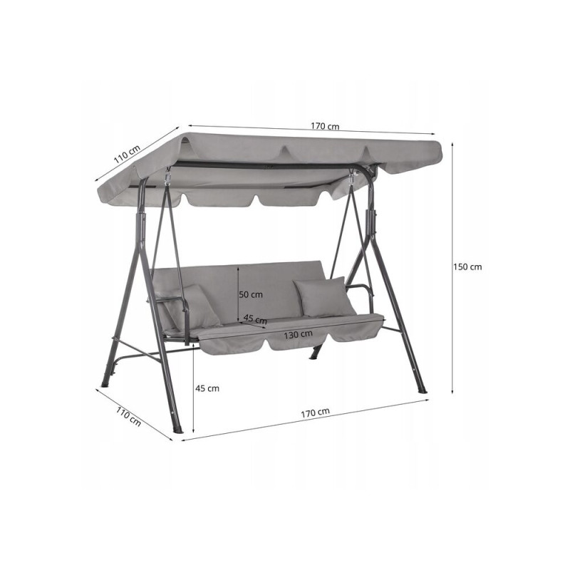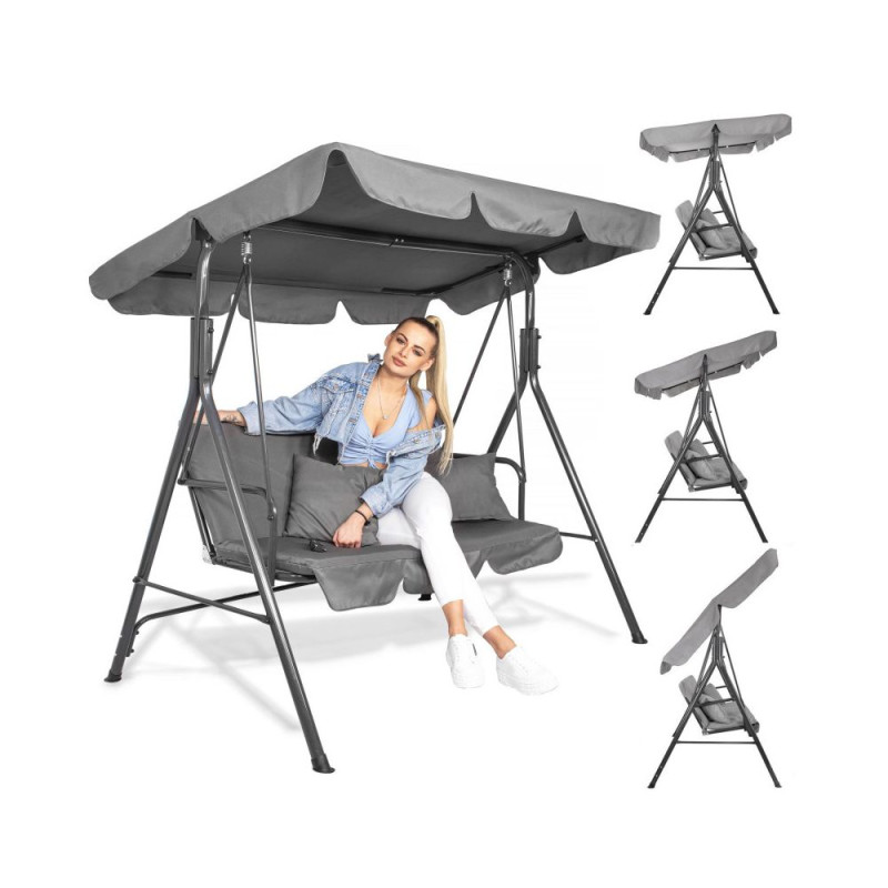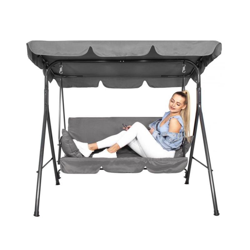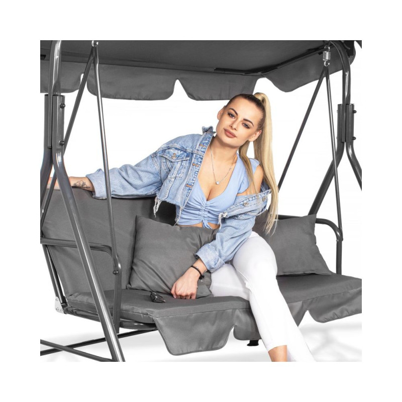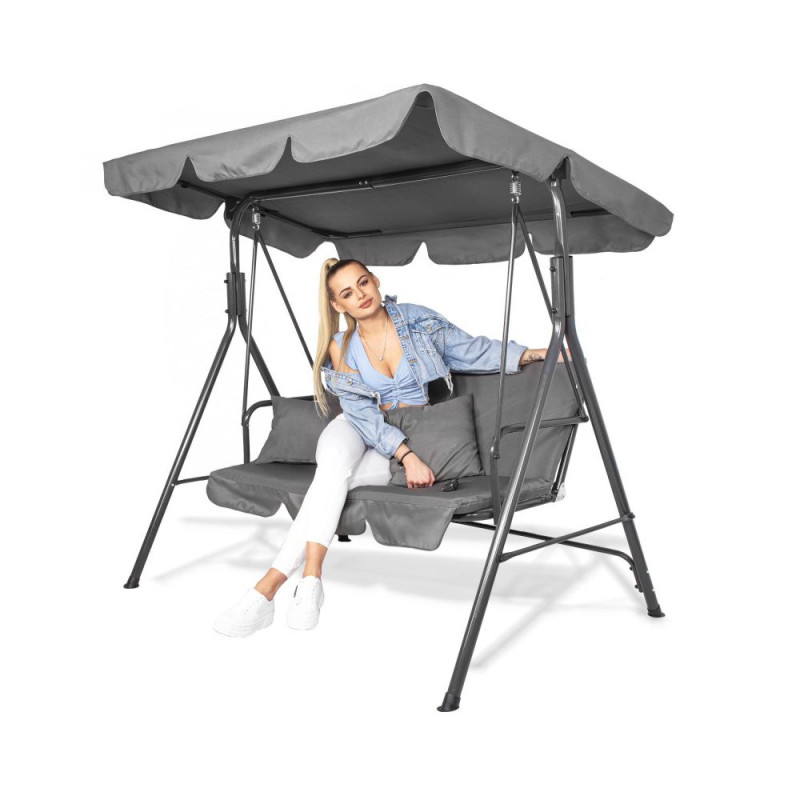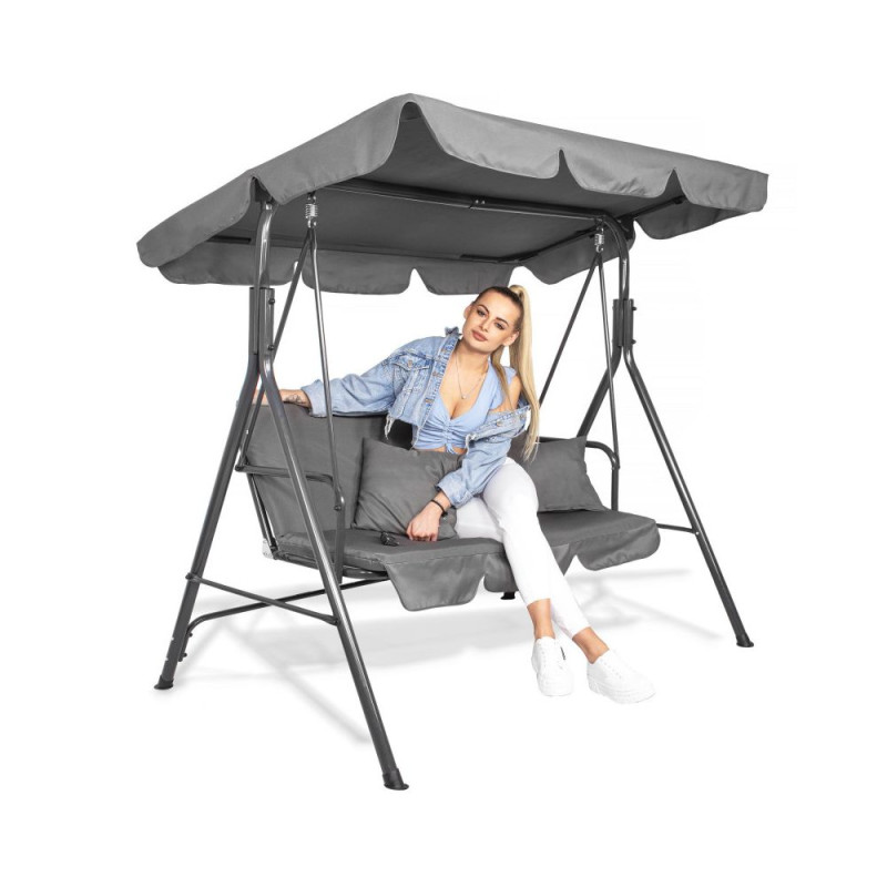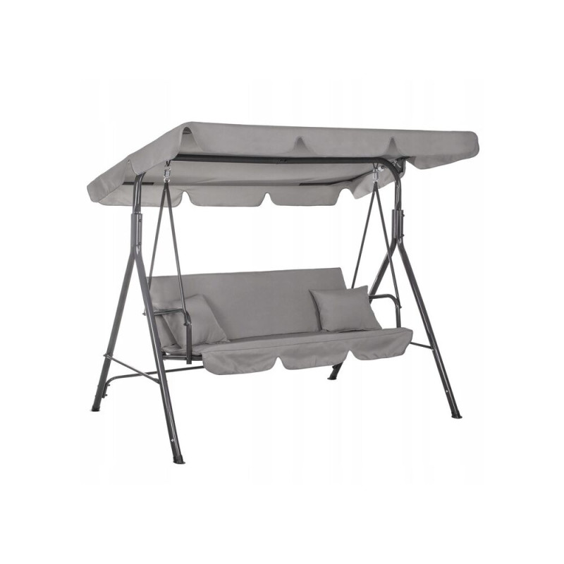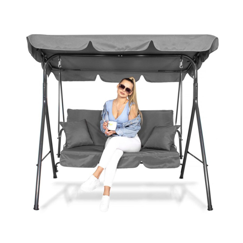 Zahradní houpačka pro 3 osoby SPRINGOS GRACE GS0013 šedá nabízí ideální prostor pro odpočinek a relaxaci na zahradě či terase. Díky pohodlnému podsedáku a dvěma polštářům si užijete maximální komfort při každém posezení.