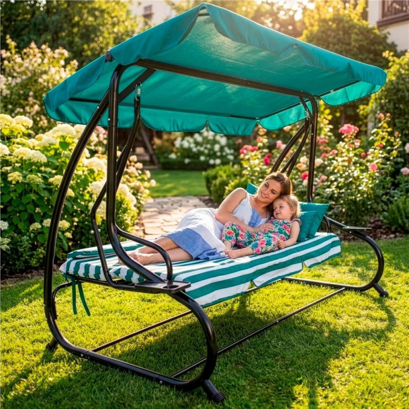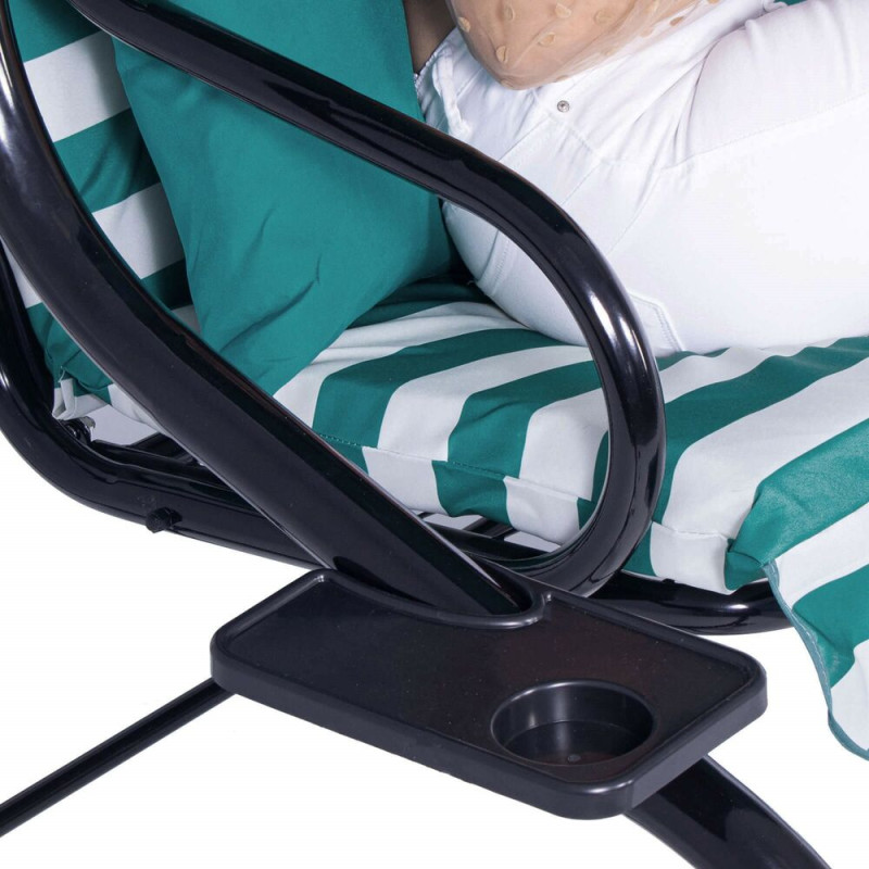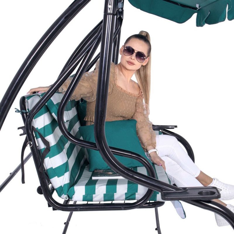 O pohodlí se stará měkký podsedák a polštáře, které zajišťují příjemné sezení i relaxaci vleže. Pružinové uchycení umožňuje plynulé a tiché houpání. Praktické odkládací stolky vám umožní mít nápoj, telefon nebo drobnosti vždy po ruce.
