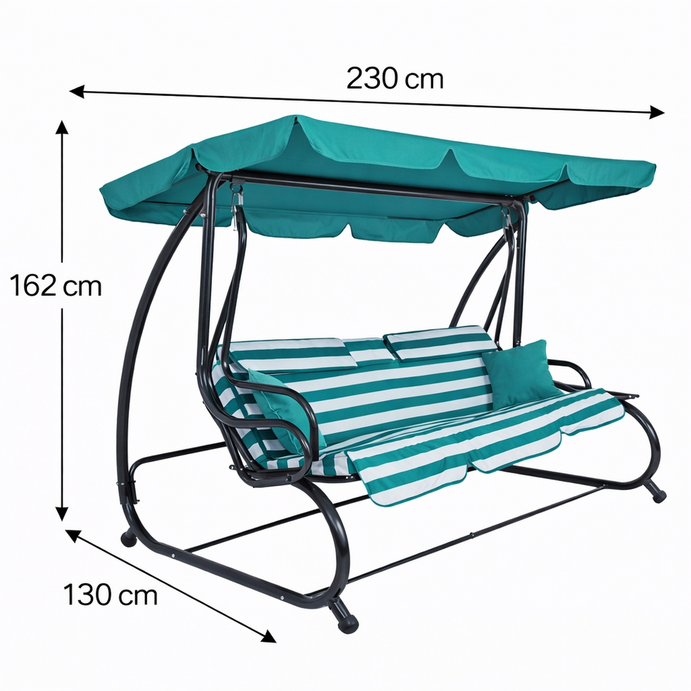 Prostorná zahradní houpačka pro pohodlný odpočinek i společné chvíle na zahradě. Nabízí velký prostor pro 3-4 osoby a možnost pohodlného ležení. Pevná kovová konstrukce. Měkký podsedák a polštáře. Nastavitelná stříška. Pružinové uchycení. Praktické odkládací stolky. Voděodolný materiál. Protiskluzové konce nohou.
