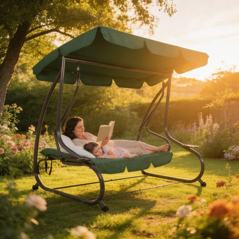 Komfortní zahradní houpačka pro klidné chvíle a ničím nerušený odpočinek na vaší zahradě. Nabízí místo pro 3-4 osoby a možnost polohování do lehu. Pevná kovová konstrukce. Pohodlný podsedák. Nastavitelná stříška. Voděodolné textilie s UV filtrem. Praktické odkládací stolky. Protiskluzové konce nohou.