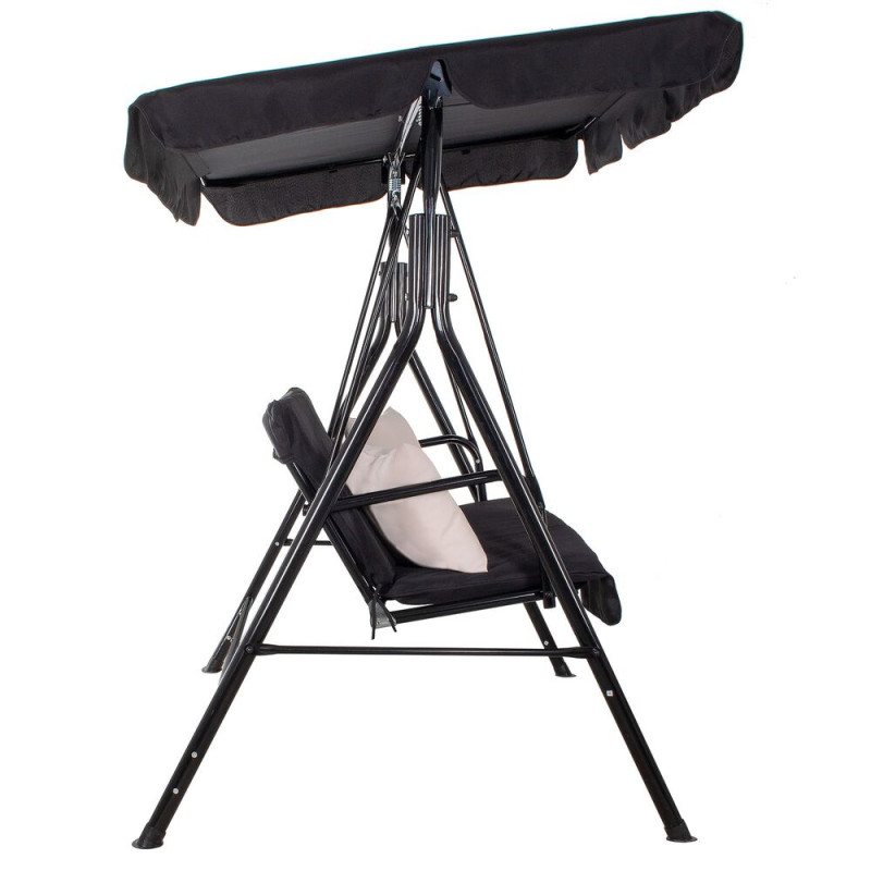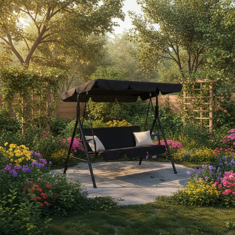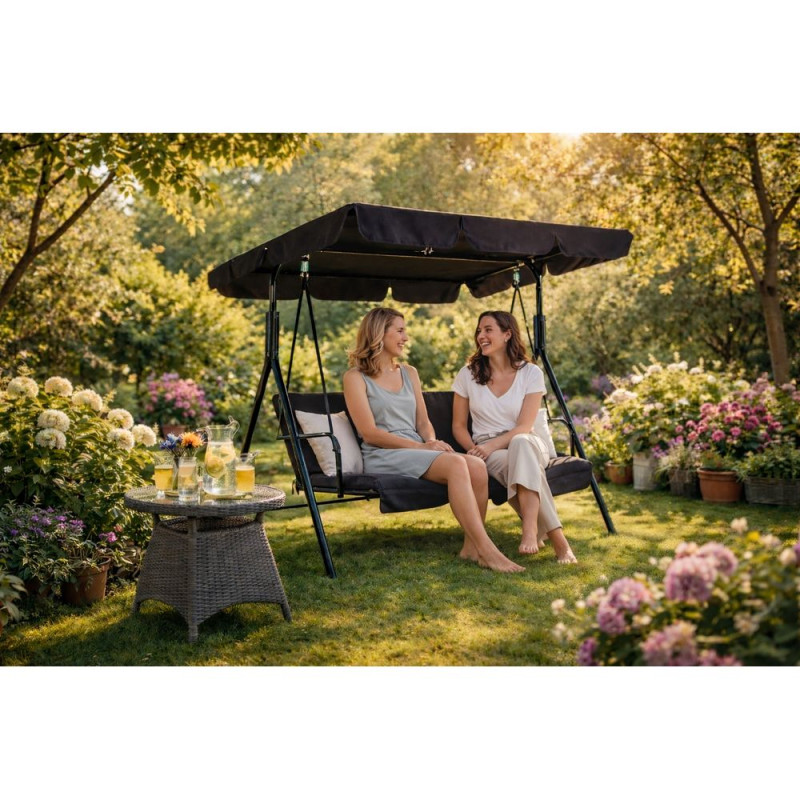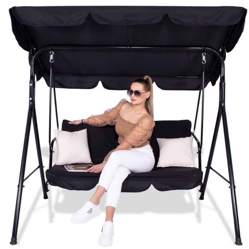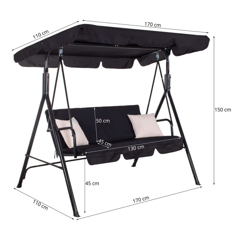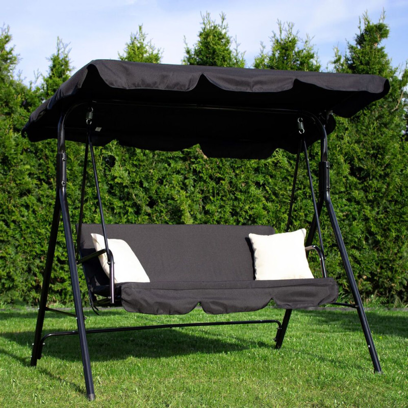 Zahradní houpačka pro 3 osoby SPRINGOS LUNA GS0014 černá nabízí ideální prostor pro odpočinek a relaxaci na zahradě či terase. Díky pohodlnému podsedáku a dvěma polštářům si užijete maximální komfort při každém posezení.