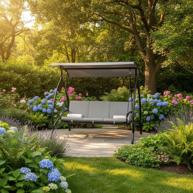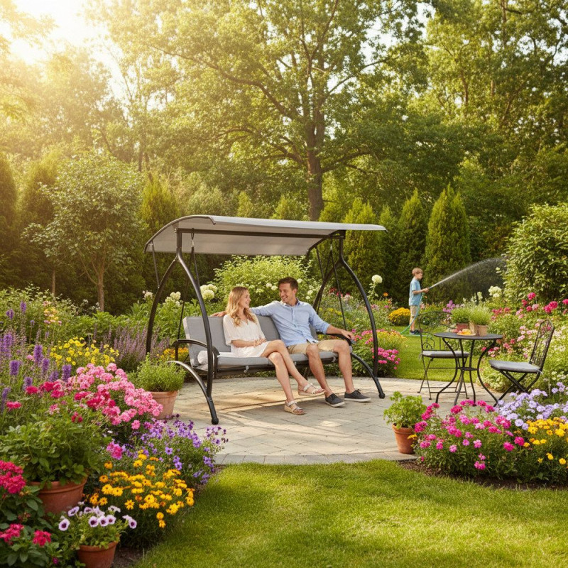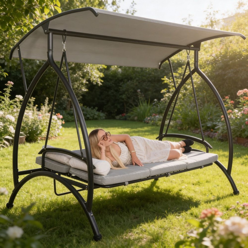 - Luxusní a prostorná zahradní houpačka pro maximální pohodlí při odpočinku i relaxaci na čerstvém vzduchu. Nabízí velkorysý prostor a vysoký komfort, kvalitní provedení matrace a polštářů se zipy. Možnost rozložení do lehu. Pevný rám odolný proti poškození. Voděodolný materiál. Ochrana proti korozi. Nastavitelná stříška. Pružinové uchycení. Protiskluzové konce nohou.