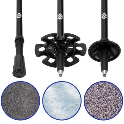 Hole jsou tvořeny dvěma teleskopickými segmenty s možností nastavení délky a pevné aretace pomocí knoflíků. Plastové klipy po upevnění drží jednotlivé části pohromadě a zabraňují jejich posunutí. Součástí jsou vyměnitelné koncovky určené na sníh, bláto, asfalt i měkkou půdu, které umožňují přizpůsobení holí různým typům terénu. Úchyty se montují šroubováním na špičku tyče, což zajišťuje pevné a stabilní uchycení při používání.