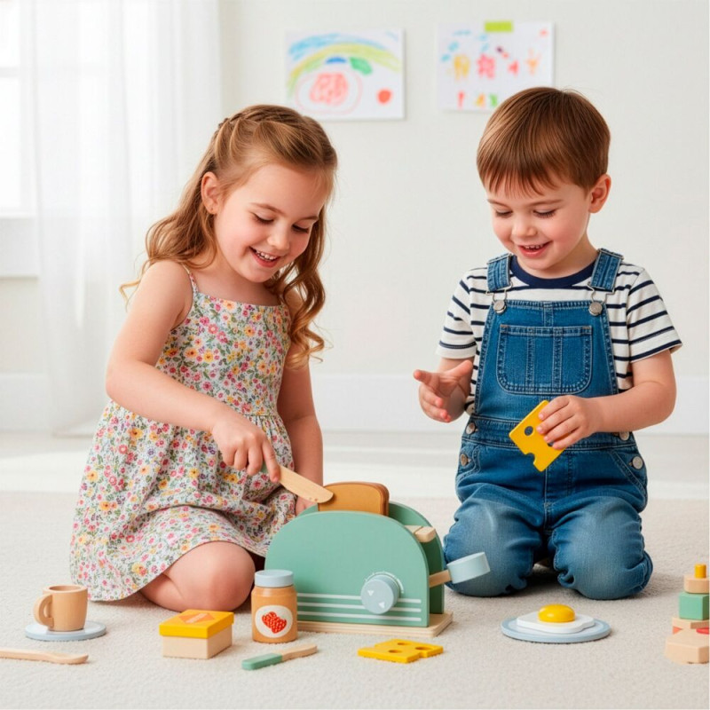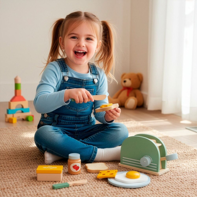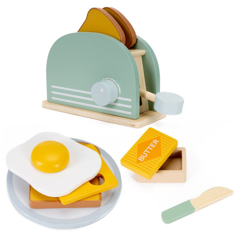 Součástí sady jsou barevné doplňky jako chléb, máslo, sýr a vejce, které umožňují přípravu různých snídaňových kombinací. Celkem 9 interaktivních prvků rozvíjí dětskou představivost, jemnou motoriku a kreativitu. Hračka je ideální pro děti od 3 let a skvěle se hodí do každé dětské kuchyňky jako zábavný i edukativní prvek.