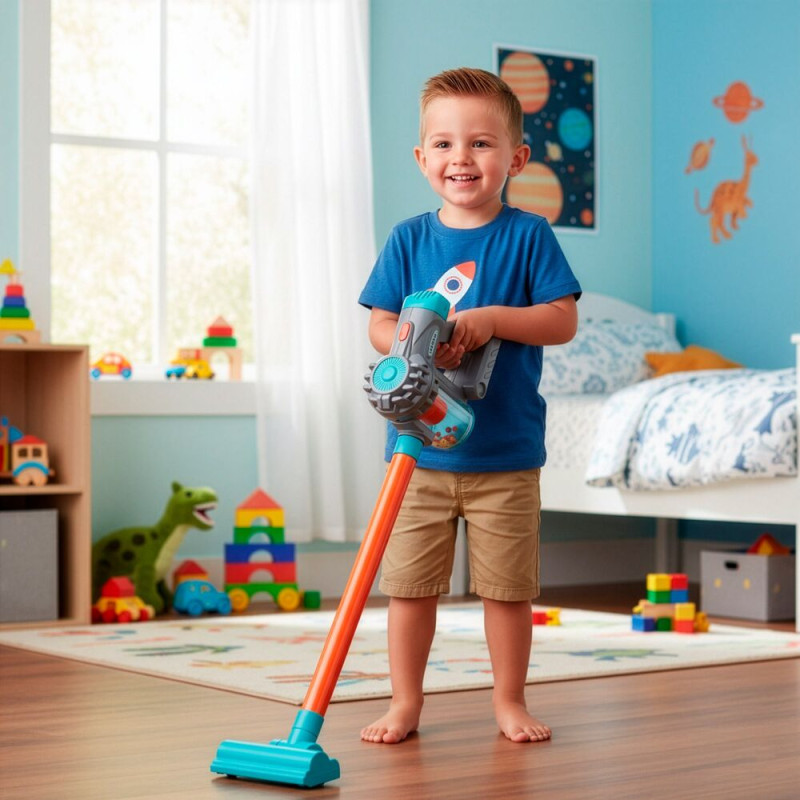 Vysavač je napájen na baterie a vyroben z odolných, bezpečných a certifikovaných materiálů, vhodných pro děti od 3 let. Hra s vysavačem podporuje rozvoj samostatnosti, zručnosti a smyslu pro pořádek, zároveň děti přirozeně zapojuje do domácích činností a přináší jim radost z aktivní hry.