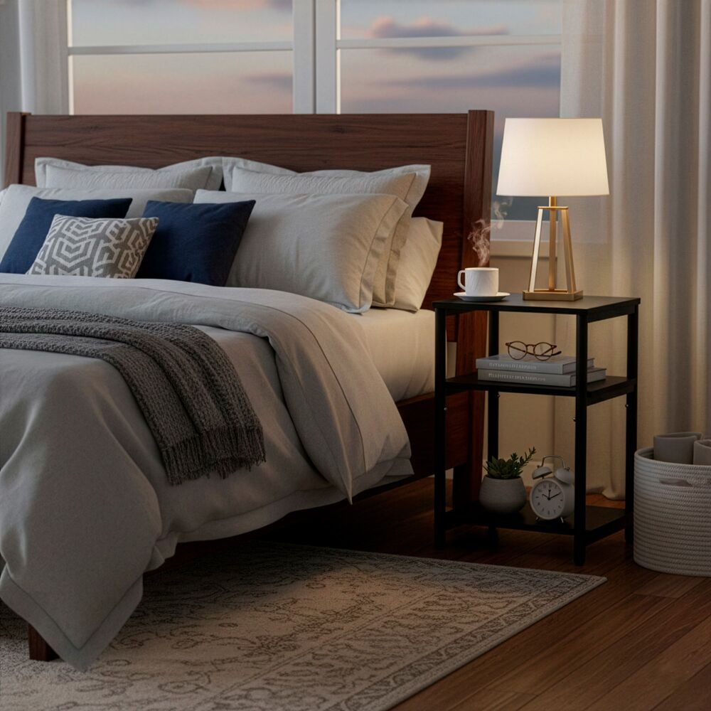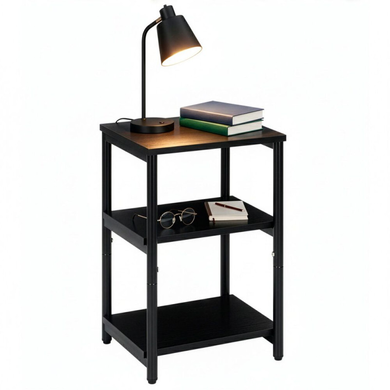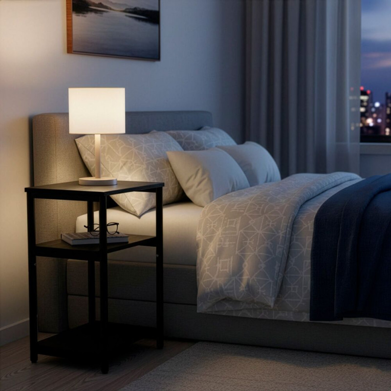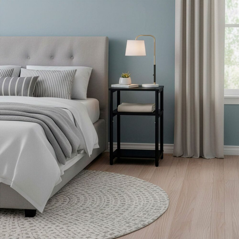 Stylový doplněk do ložnice v černém provedení s kontrastní kovovou konstrukcí vytváří pevné a přehledné místo pro každodenní odkládání. Tři otevřené úrovně poskytují prostor pro knihu, telefon, lampičku i dekorace. Díky kompaktním rozměrům se hodí i k menším postelím a přirozeně zapadne do moderního interiéru.