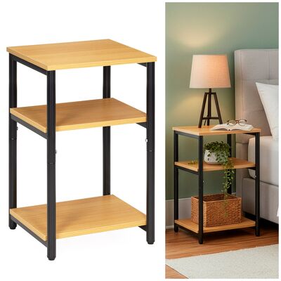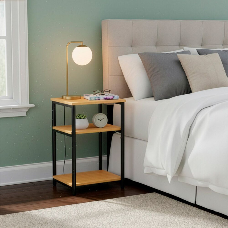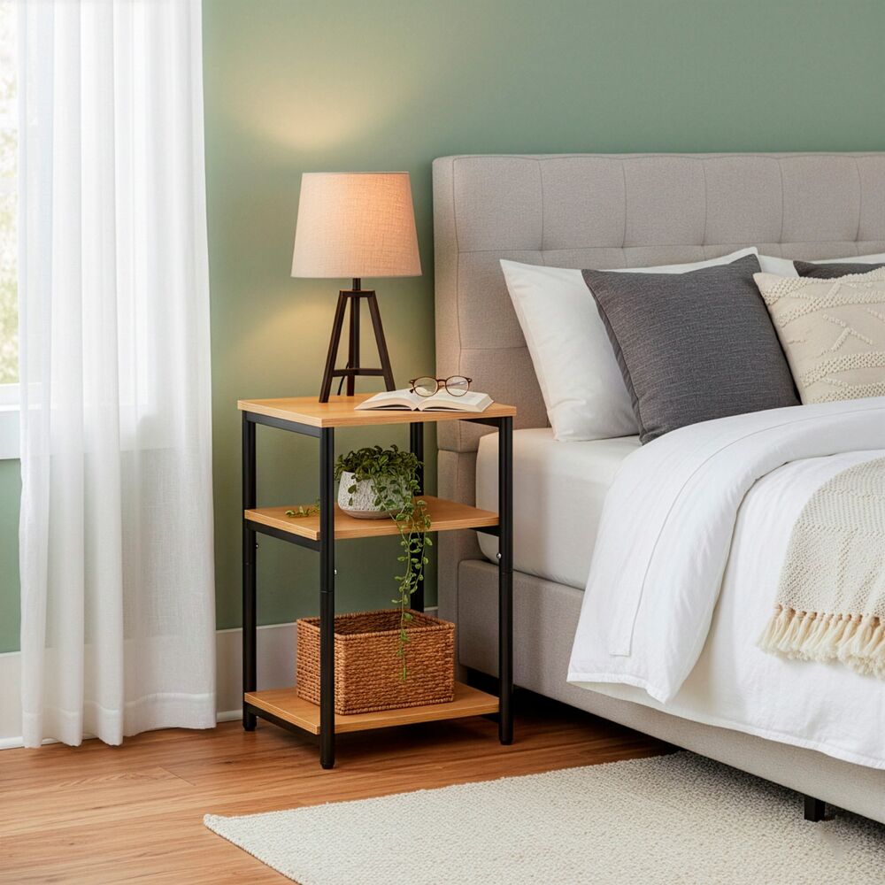 Stylový doplněk do ložnice ve světle hnědém provedení s kontrastní kovovou konstrukcí vytváří pevné a přehledné místo pro každodenní odkládání. Tři otevřené úrovně poskytují prostor pro knihu, telefon, lampičku i dekorace. Díky kompaktním rozměrům se hodí i k menším postelím a přirozeně zapadne do moderního interiéru.