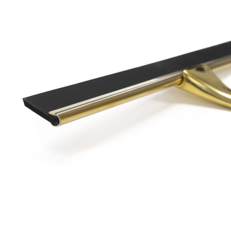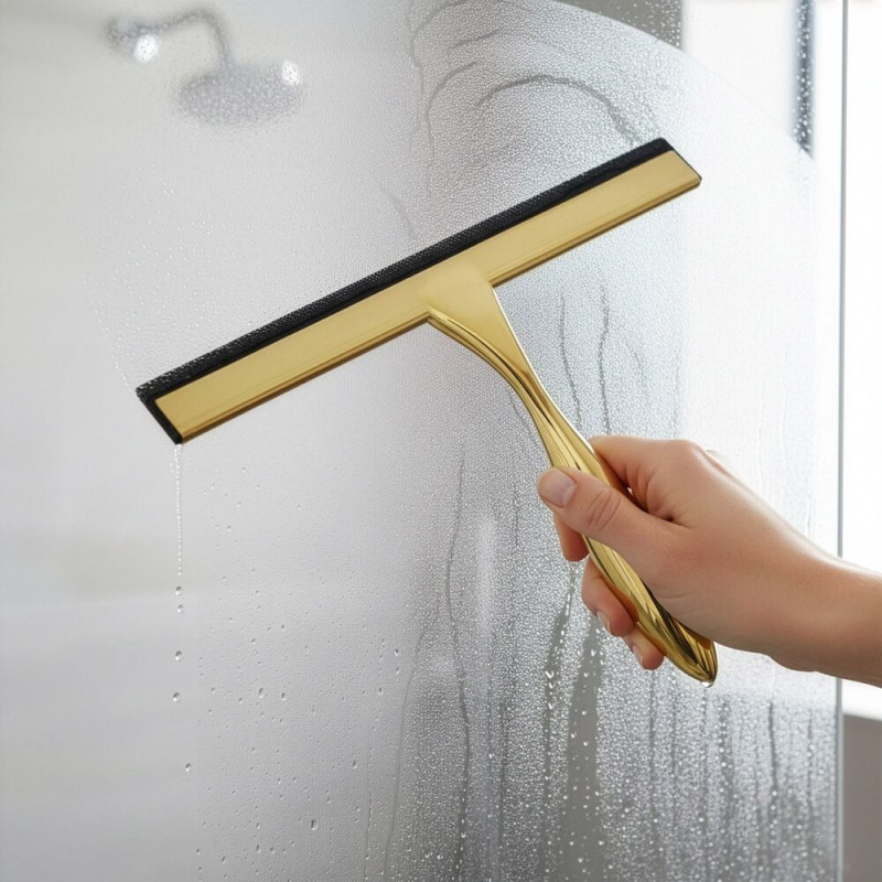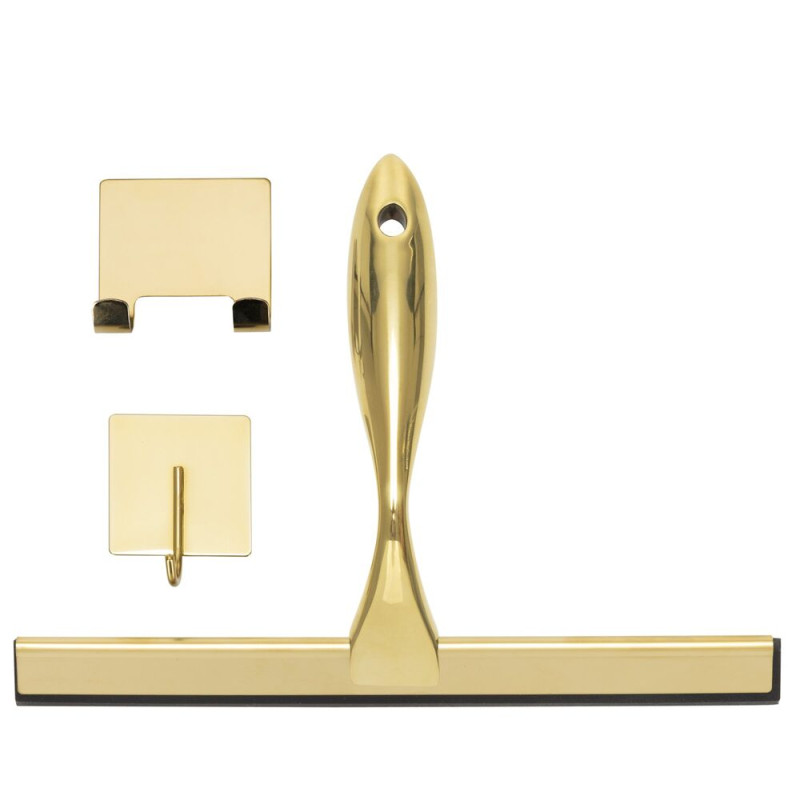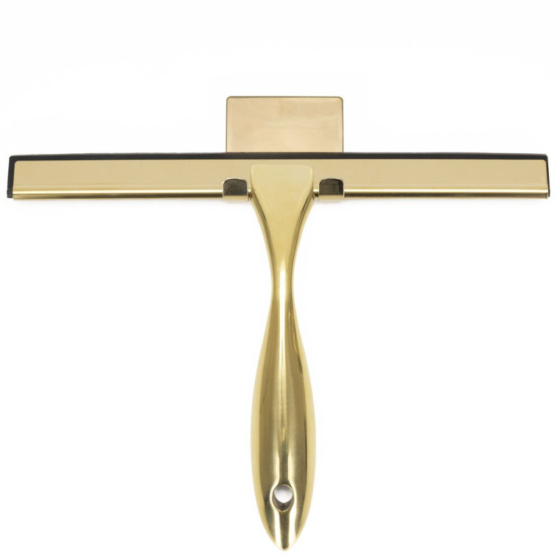 Praktická koupelnová stěrka vhodná jako stěrka do sprchy i stěrka do sprchového koutu. Hladká stírací hrana zajistí účinné setření vody bez šmouh a pomáhá omezit usazování vodního kamene. Ergonomická rukojeť umožňuje pohodlný úchop a snadnou manipulaci. Přísavky na uchycení umožní praktické zavěšení přímo v koupelně, aby byla vždy po ruce. Elegantní zlaté provedení doplní moderní interiér. Rozměry 25x18,5 cm.