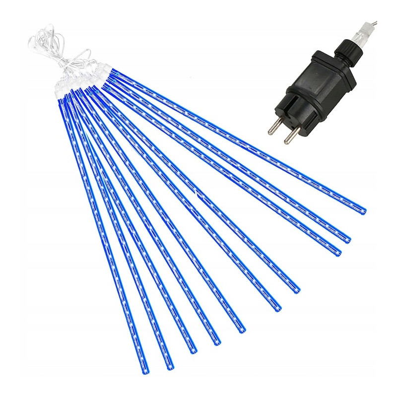 Světelný řetěz s 10 rampouchy a působivým efektem padajícího sněhu. Adaptér na bezpečné napětí, ultra úsporné led diody, transparentní kabel. Vnitřní i venkovní použití, voděodolné provedení, krytí IP44. Délka světelné části 4 m, napájecí kabel 2 m. Barva modrá, 480 led, výška rampuchů 50 cm.