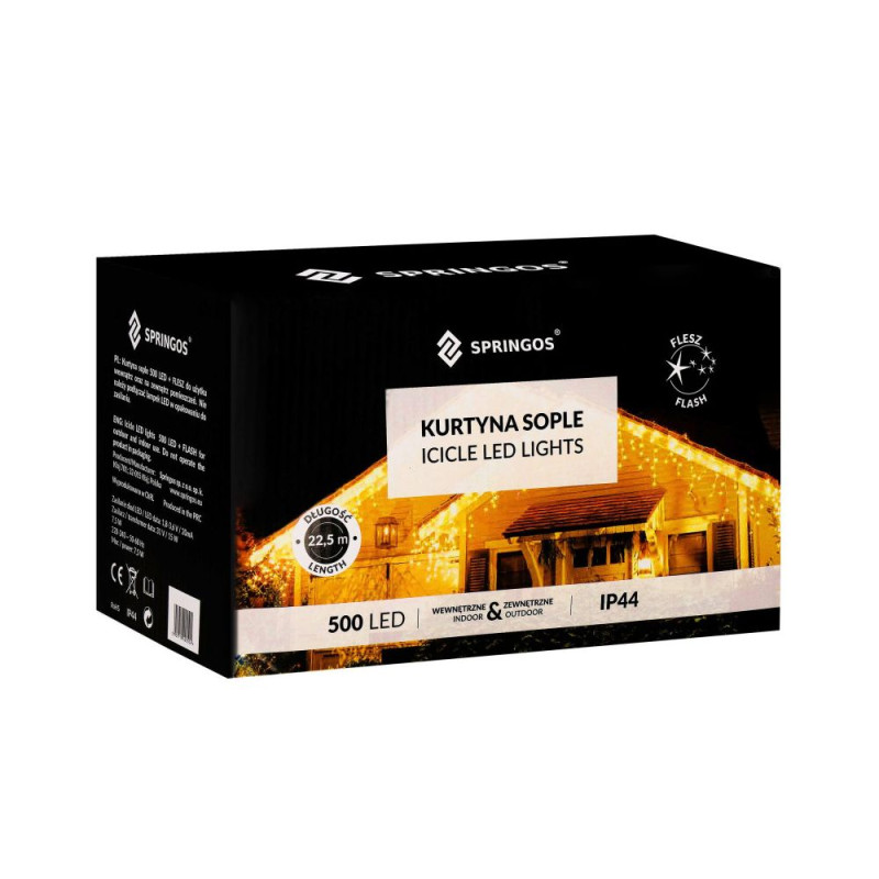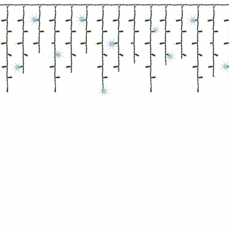 Světelný řetěz se záblesky a různou výškou volně visících krápníků. Úsporné led diody, vnitřní i venkovní použití, voděodolné provedení, krytí IP44. Délka světelné části 20 m, napájecí kabel 2,5 m. Barva teplá bílá + záblesky studená bílá, 500 led.