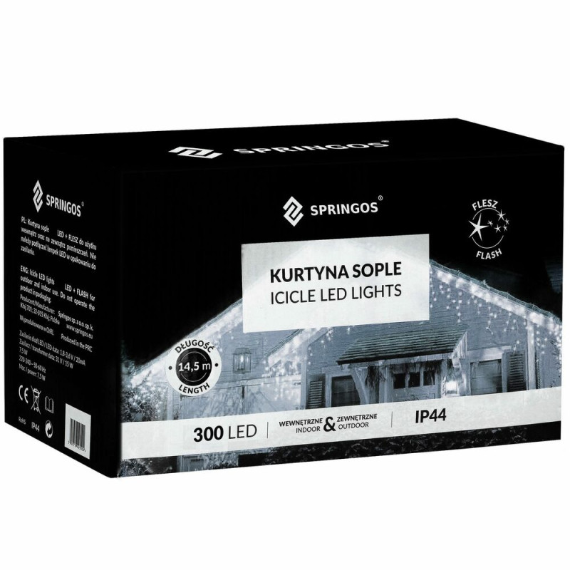 Světelný řetěz se záblesky a různou výškou volně visících krápníků. Časovač, adaptér na bezpečné napětí, ultra úsporné led diody. Vnitřní i venkovní použití, voděodolné provedení, krytí IP44. Délka světelné části 13 m, napájecí kabel 2,5 m. Barva studená bílá + záblesky studená bílá, 300 led.