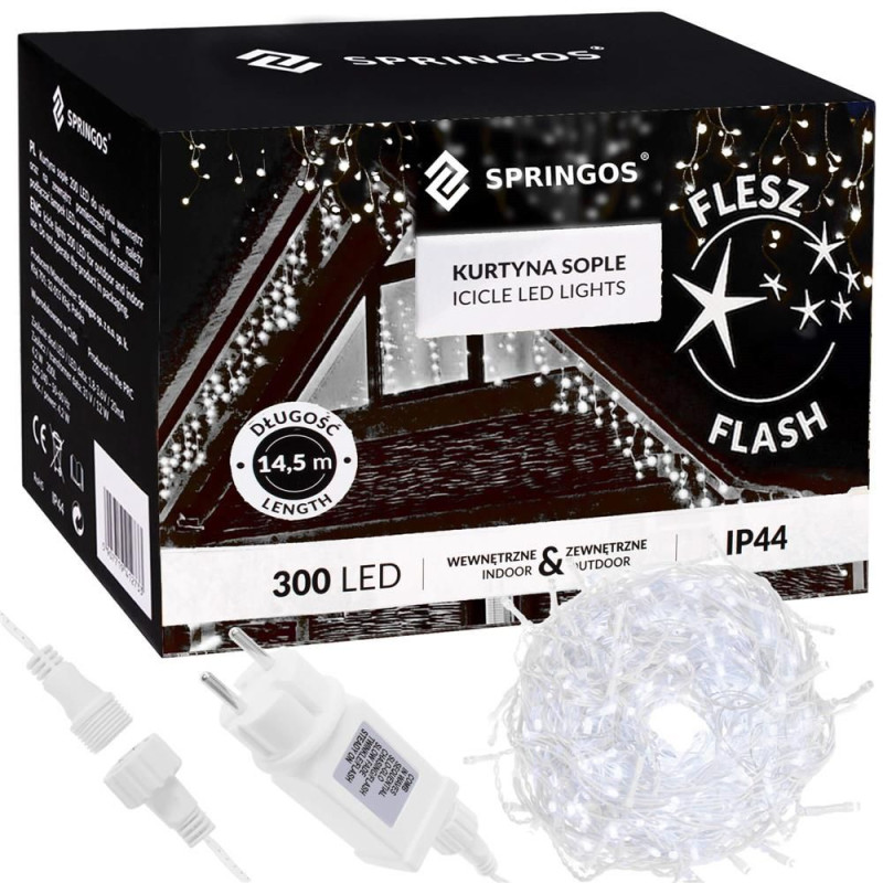 Světelný řetěz se záblesky a různou výškou volně visících krápníků. Časovač, adaptér na bezpečné napětí, ultra úsporné led diody. Vnitřní i venkovní použití, voděodolné provedení, krytí IP44. Délka světelné části 12 m, napájecí kabel 2,5 m. Barva studená bílá + záblesky studená bílá, 300 led.