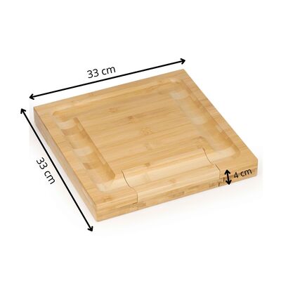 Servírovací prkénko z bambusu je stylový dřevěný podnos vhodný pro podávání sýrů, uzenin i dalších pochutin. Slouží jako servírovací prkénko i praktický tác na slavnostní i běžné stolování. Součástí jsou 3 nože na sýr a 1 vidlička, které jsou uložené ve výsuvné zásuvce. Přírodní vzhled krásně doplní každý stůl a zajistí elegantní servírování. Rozměr 33x33x4 cm.