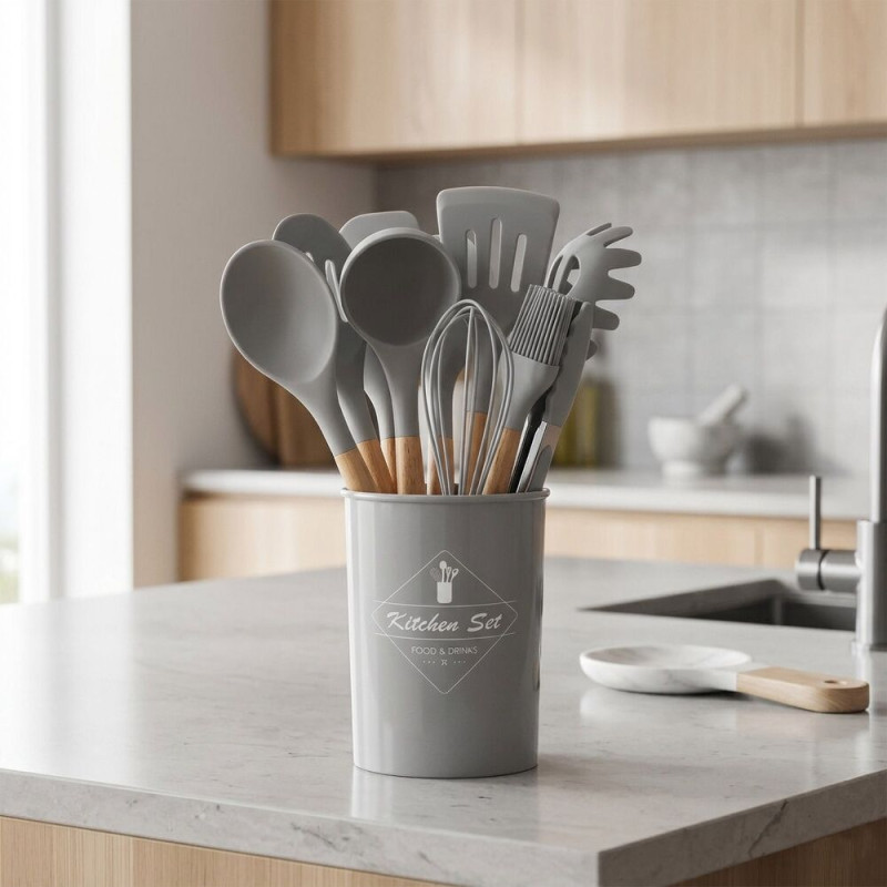 Náčiní je vyrobeno z kombinace silikonu a bambusu, která zajišťuje odolnost, dlouhou životnost a šetrnost k nádobí. Silikonové části nepoškrábou povrch hrnců a pánví, zatímco bambusové rukojeti poskytují pevný a pohodlný úchop. Součástí je také praktický stojánek pro přehledné uložení.