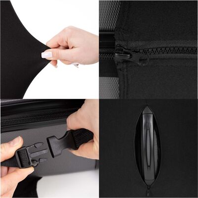 Praktické provedení zahrnuje dvoucestný zip, který usnadňuje rychlé nasazení i sejmutí, a elastický popruh s přezkou pro pevné uchycení ke spodní části kufru. Samozřejmostí jsou otvory pro horní i boční madlo, které umožňují pohodlnou manipulaci. Velkou výhodou je také možnost praní v pračce, díky níž je údržba obalu jednoduchá a vhodná pro dlouhodobé opakované používání.
