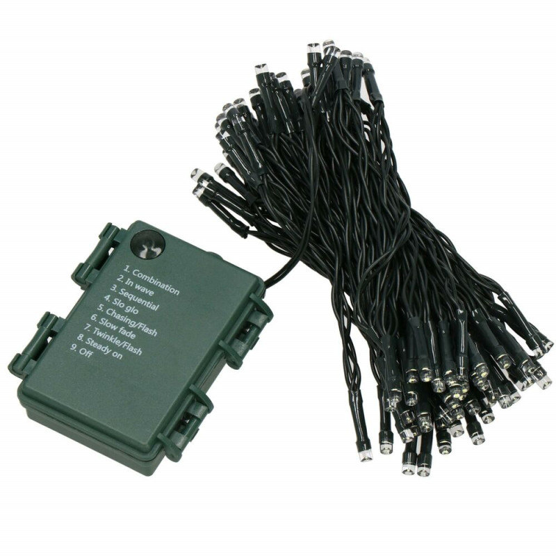 LED světelný řetěz s 8 světelnými funkcemi. Napájením na baterie, úsporné mikro diody, vnitřní i venkovní použití. Voděodolné provedení, krytí IP44. Délka světelné části 5 m, napájecí kabel 50 cm. Barva teplá bílá, 50 led, napájení 3x AA baterie.