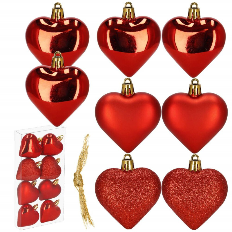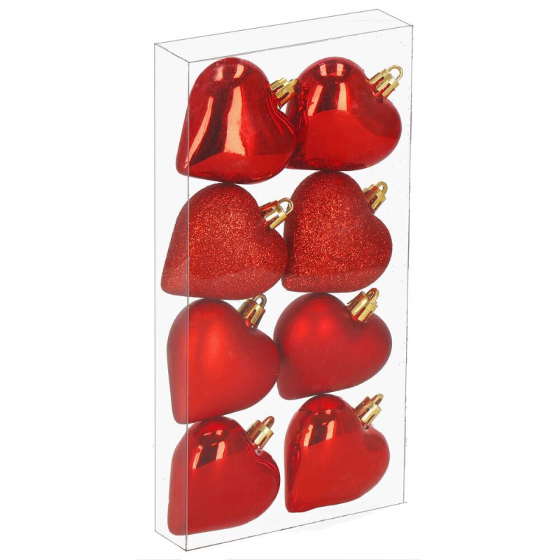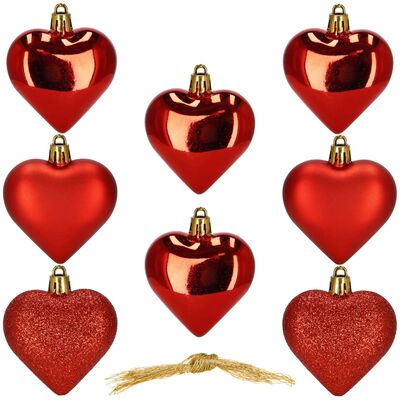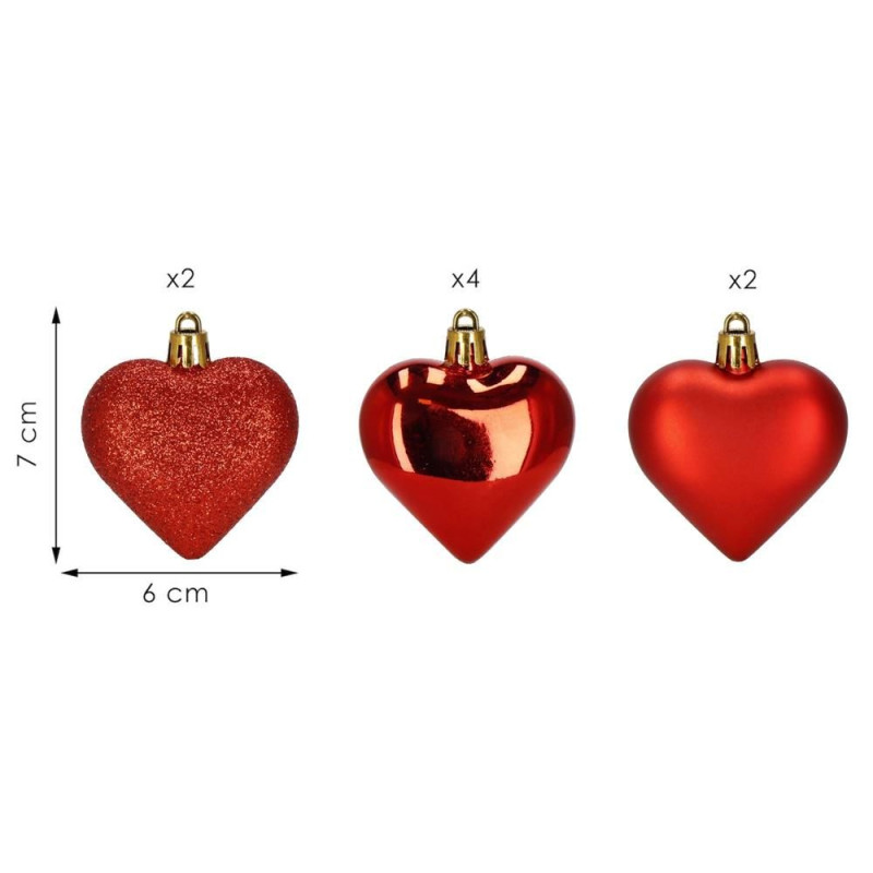 Sada vánočních ozdob ve tvaru srdíček v červeném provedení dodá vaší výzdobě hřejivý a slavnostní vzhled. Ideální jako dekorace na vánoční stromeček, sváteční stůl nebo do oken. Vyrobeny z nerozbitného plastového materiálu, vhodné pro vnitřní i venkovní použití. Součástí balení jsou poutka pro zavěšení. Průměr 6 cm, celkem 8 kusů v sadě.