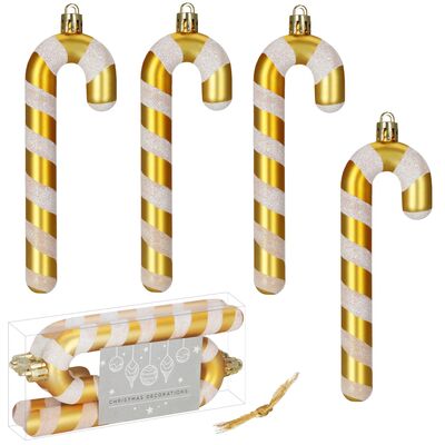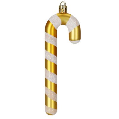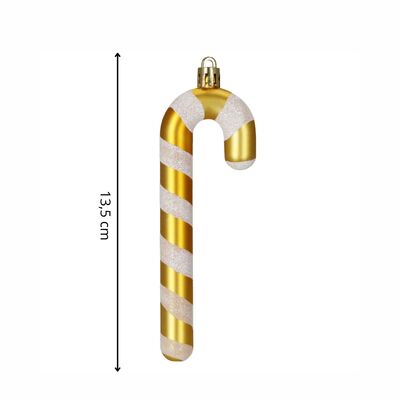 Lesklé a třpytivé vánoční ozdoby ve tvaru zlatých cukrových hůlek dodají stromku elegantní a moderní vzhled. Jsou vyrobeny z nerozbitného plastu, takže jsou lehké a bezpečné. Díky poutku a přiloženému provázku je snadno zavěsíte kamkoli. Rozměry 14 × 1,5/4,5 cm z nich dělají výrazný, ale stále jemný dekorativní prvek.