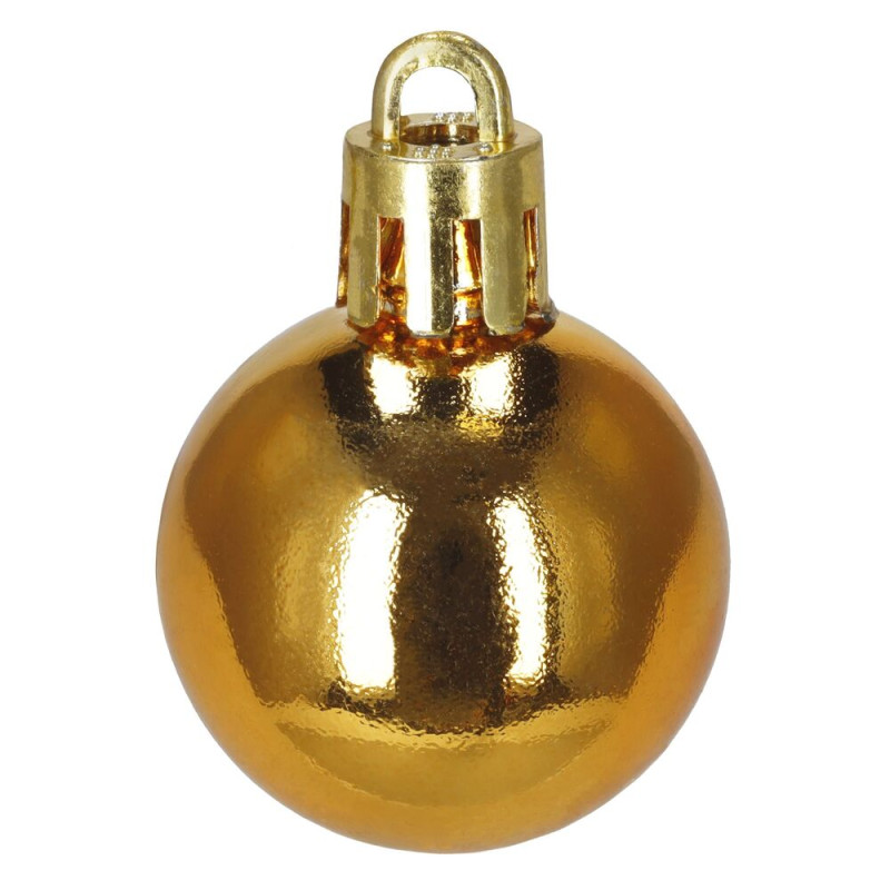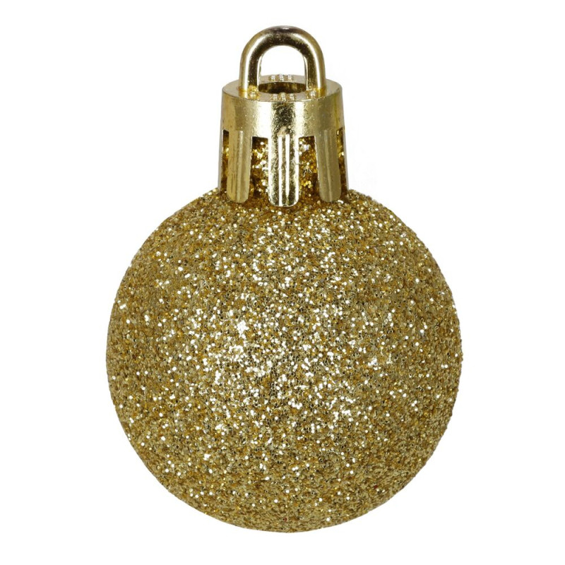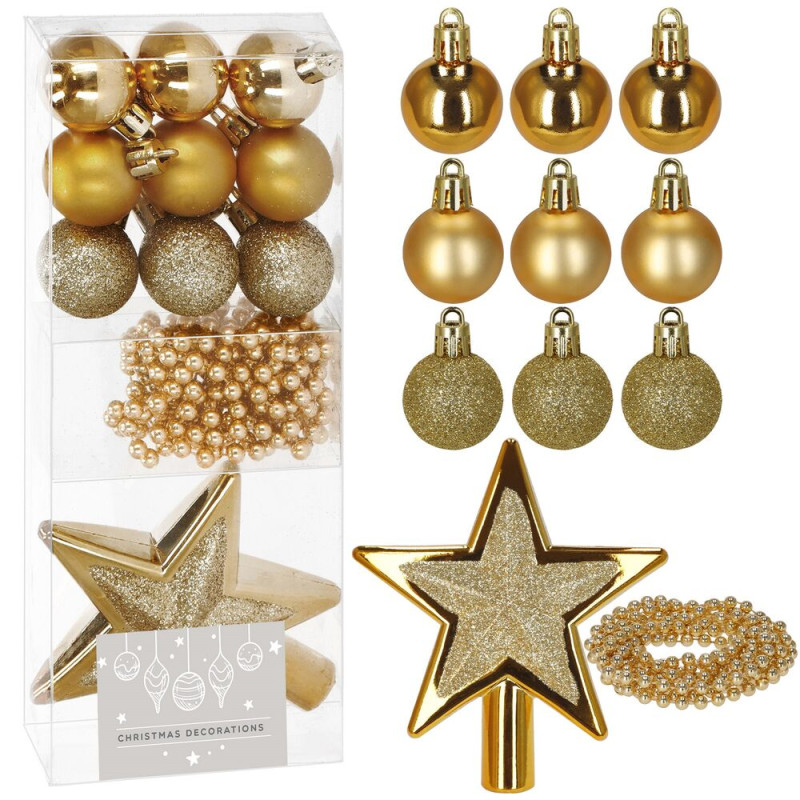 Kompletní sada vánočních ozdob v elegantní zlaté barvě dodá stromku jednotný a slavnostní vzhled. Obsahuje baňky, třpytivou hvězdu a dekorativní girlandu v kombinaci matného, lesklého a třpytivého provedení. Ozdoby jsou vyrobeny z nerozbitného plastu, mají poutka a přiloženou zlatou šňůrku pro snadné zavěšení. Ideální volba pro stylově sladěnou výzdobu.