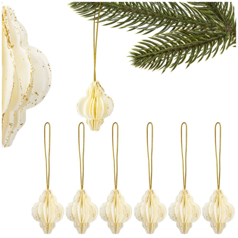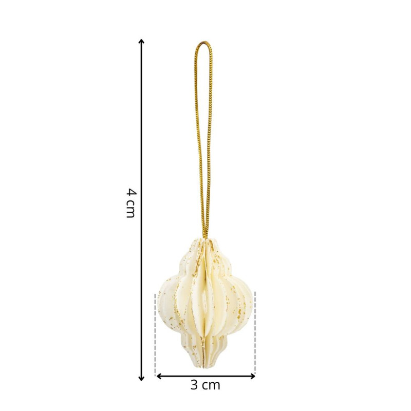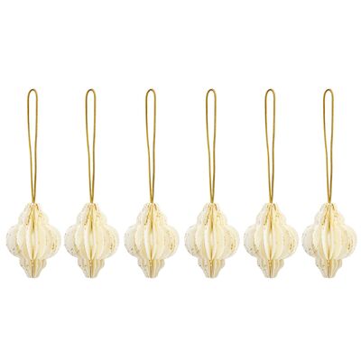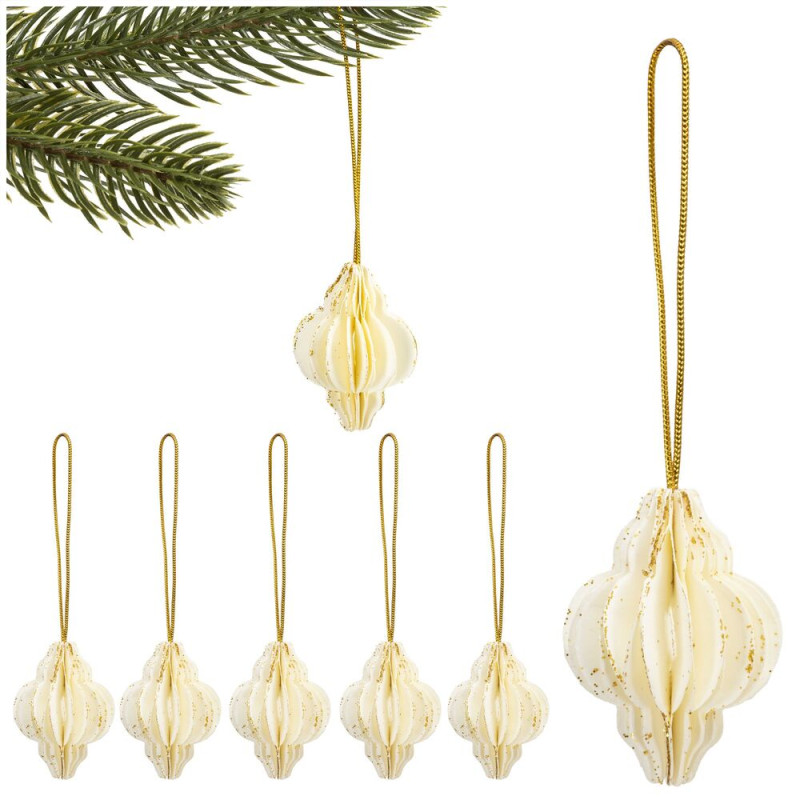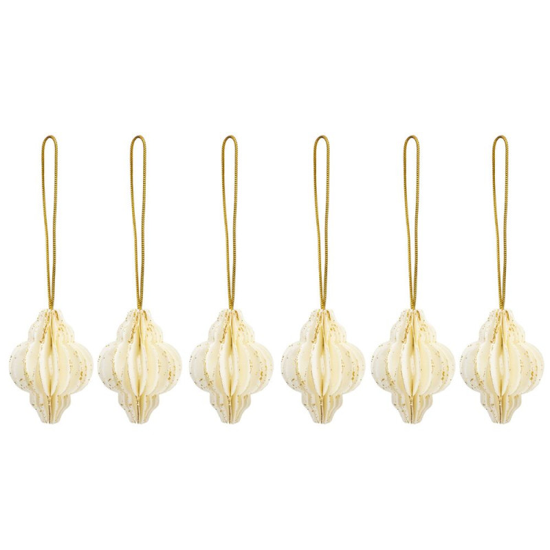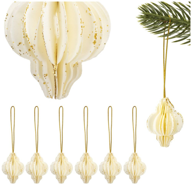 Sada šesti bílých papírových ozdob se zlatým třpytem vnese do výzdoby něžný a slavnostní nádech. Díky poutkům je snadno zavěsíte na stromek i do dalších dekorací, kde jemně zazáří. Lehký papírový materiál je ideální pro vnitřní použití a v kombinaci se světýlky působí velmi kouzelně. Skvělé pro vytvoření elegantní, útulné a harmonické vánoční atmosféry.