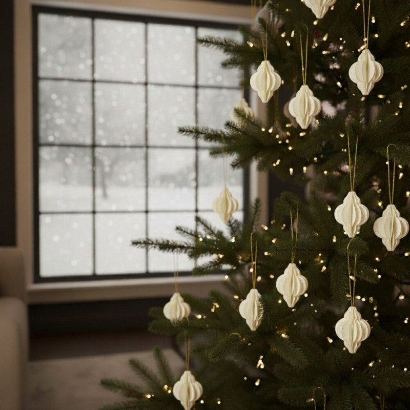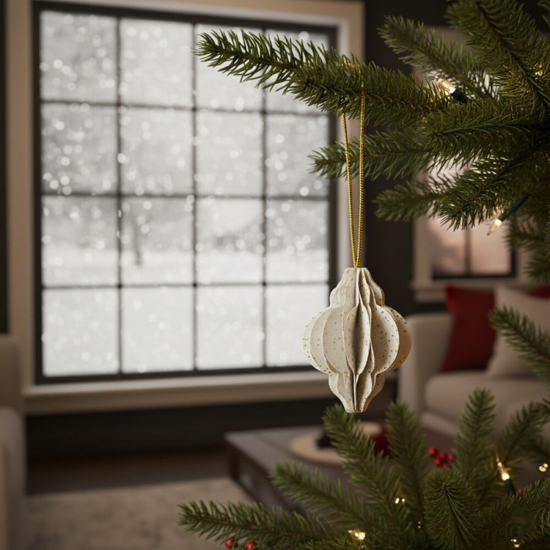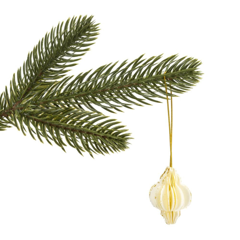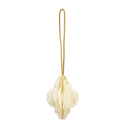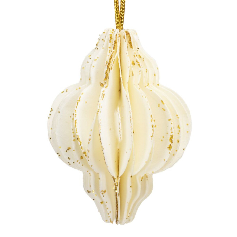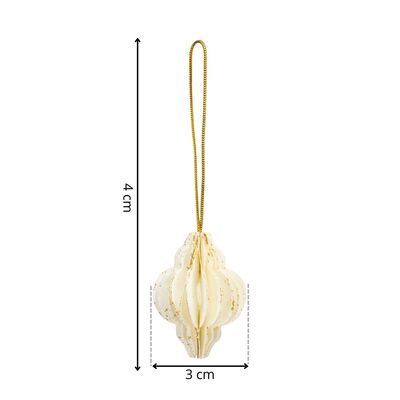 Sada šesti bílých papírových ozdob se zlatým třpytem vnese do výzdoby něžný a slavnostní nádech. Díky poutkům je snadno zavěsíte na stromek i do dalších dekorací, kde jemně zazáří. Lehký papírový materiál je ideální pro vnitřní použití a v kombinaci se světýlky působí velmi kouzelně. Skvělé pro vytvoření elegantní, útulné a harmonické vánoční atmosféry.
