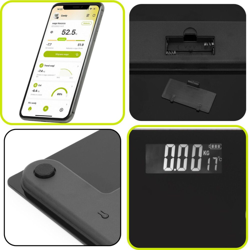 Váha je vybavena velkým LCD displejem, který zobrazuje hmotnost, teplotu a stav baterie. V mobilní aplikaci získáte detailní přehled o hodnotách jako BMI, složení těla, kostní hmota, bílkoviny, MBR, metabolický věk, míra obezity a hmotnost bez tuku. Vše přehledně uložené pro dlouhodobé sledování pokroku.