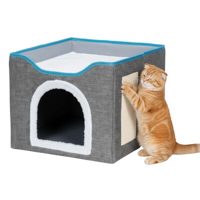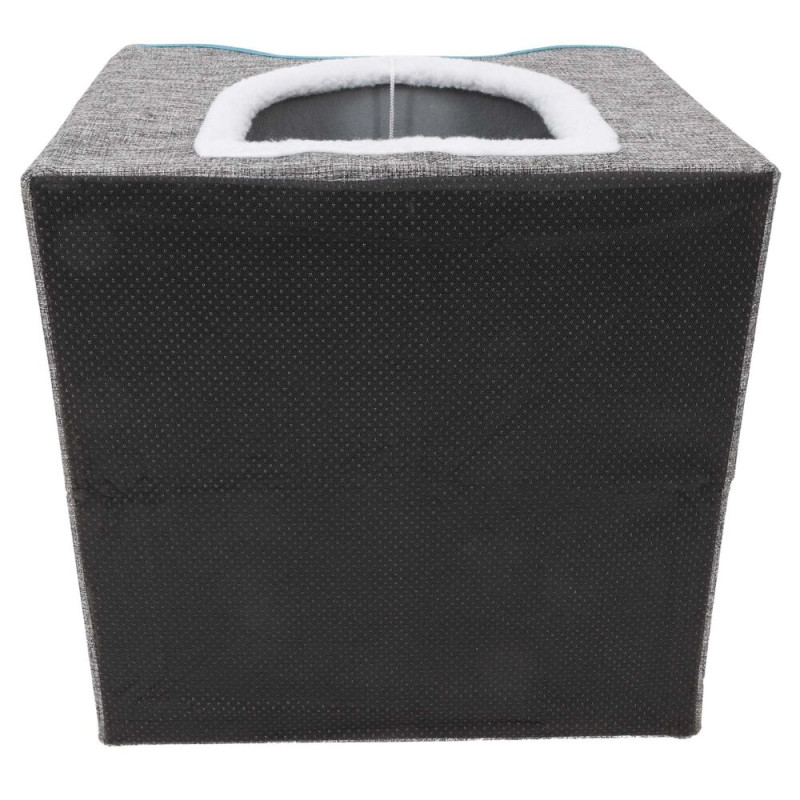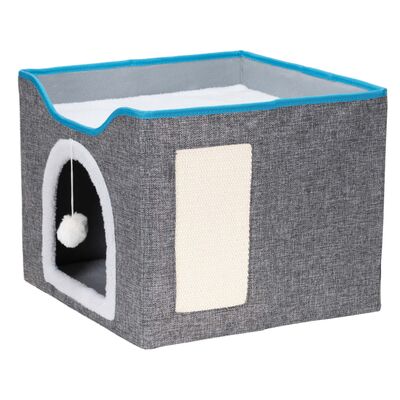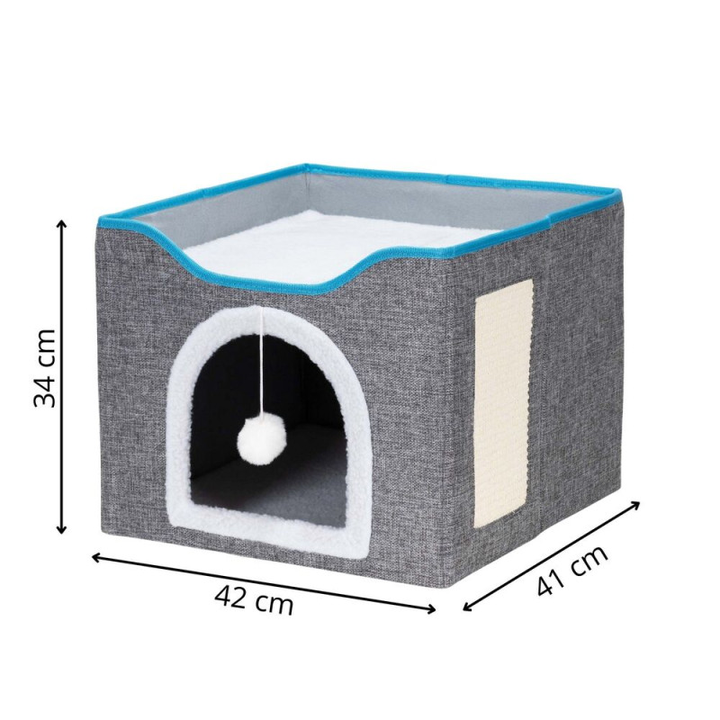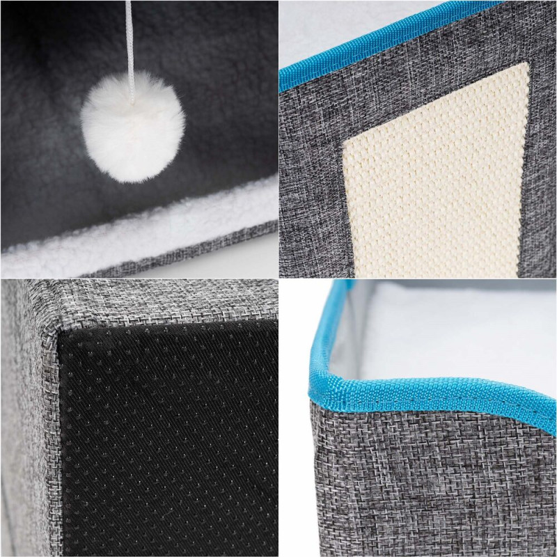 Součástí domečku je škrabadlo pro broušení drápků, které pomáhá chránit nábytek, a zavěšená bambulka pro hravou zábavu. Stabilitu zajišťuje protiskluzová základna, zatímco odnímatelný polštář a vyjímatelné horní patro usnadňují údržbu. Domeček je lehce přenosný, bezpečný a poskytuje kočce ideální prostor pro odpočinek, hraní i škrábání.