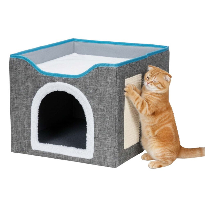 Praktický domeček pro kočku slouží jako pelíšek, úkryt i prostor pro hru a škrábání. Nabízí vyvýšené patro pro odpočinek, škrabadlo na broušení drápků a zavěšenou bambulku pro zábavu. Protiskluzová základna zajišťuje stabilitu, odnímatelný polštář i horní patro usnadňují údržbu. Domeček je lehký, snadno přenosný a poskytuje kočce bezpečné a útulné místo.