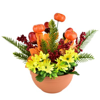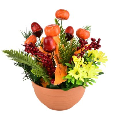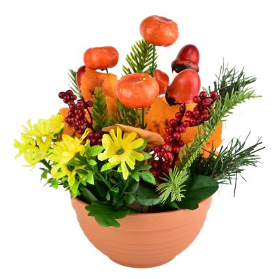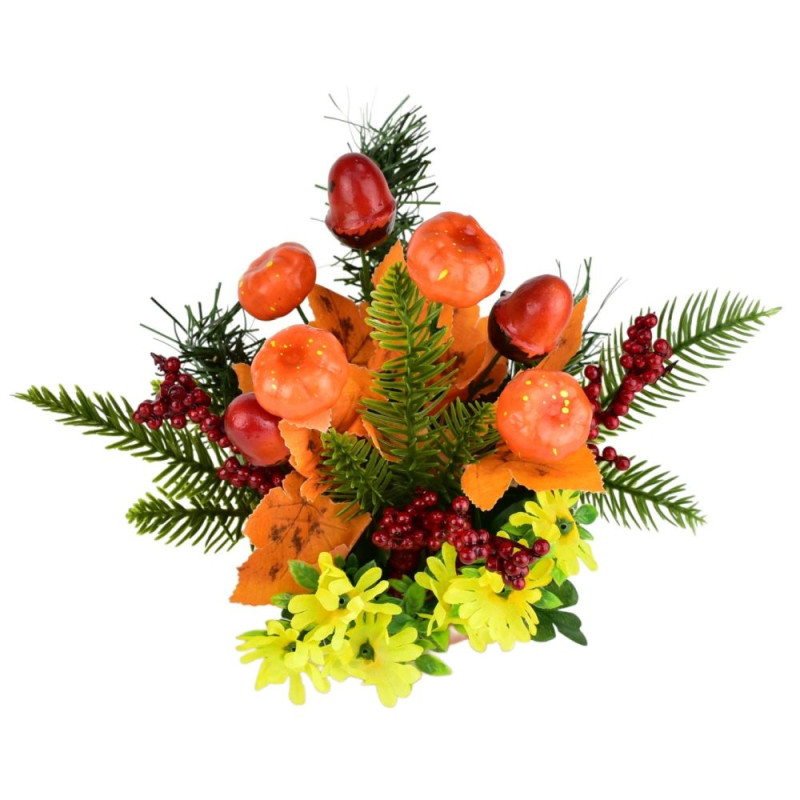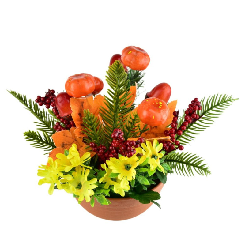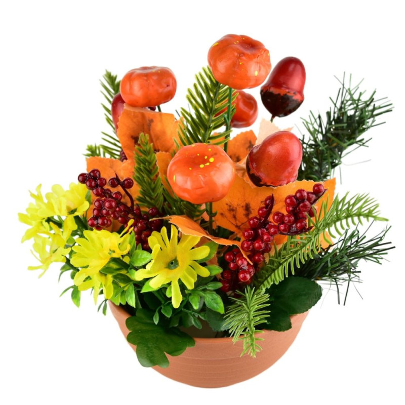 Aranžmá tvoří miniaturní dýně, žaludy, jehličí a barevné listy, které společně vytvářejí příjemnou sezónní atmosféru. Podzimní dekorace v terakotovém květináči rozzáří každý interiér i exteriér. Díky použití kvalitního plastu a sádry si zachovává svůj tvar i barvy po dlouhou dobu. Ideální jako výzdoba na stůl, do předsíně či na terasu. Rozměry dekorace jsou 25 × 25 × 25 cm.