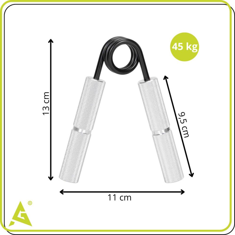 Pomůcka je vybavena ocelovou 34 mm pružinou, která zajišťuje stabilní a dlouhodobě spolehlivý odpor. Hliníkové protiskluzové rukojeti poskytují jistý a pohodlný úchop i při intenzivním cvičení. Díky kompaktní velikosti ji snadno vezmete s sebou kamkoli a můžete trénovat doma, v práci i na cestách.