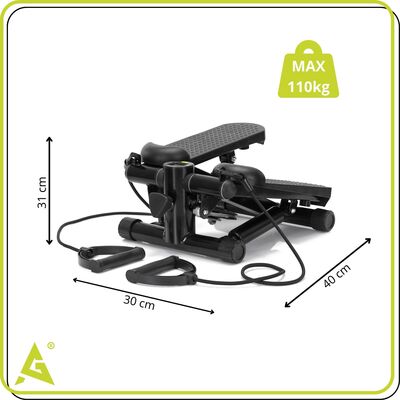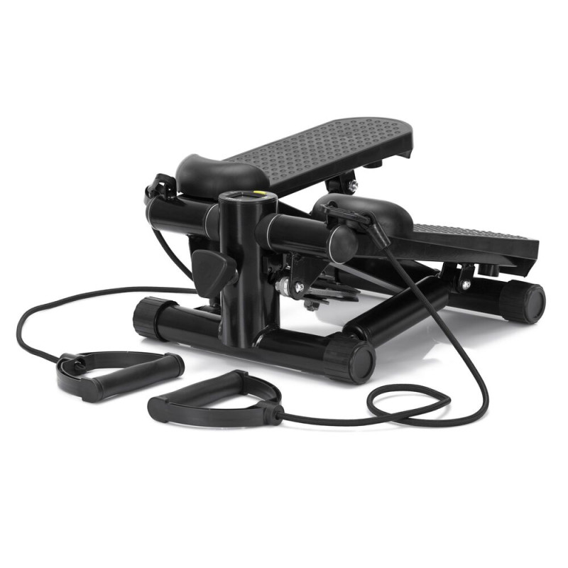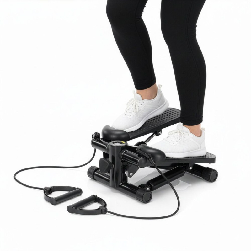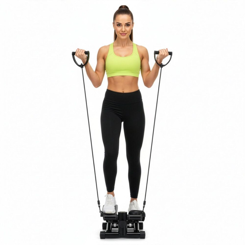 Víceúčelový stepper s gumovými expandéry pro komplexní trénink celého těla. Měkčené úchopy zajišťují pohodlné cvičení. Nastavitelné hydraulické válce umožňují regulaci zátěže. Protiskluzový povrch na nohy zvyšuje bezpečnost. Počítač s LCD displejem sleduje základní údaje o tréninku. Nastavení intenzity cvičení, kompaktní design, současně procvičuje nohy, paže i horní část těla, ideální na hubnutí i zlepšení kondice.