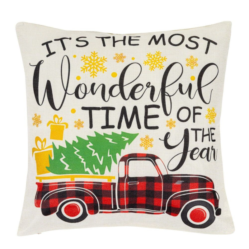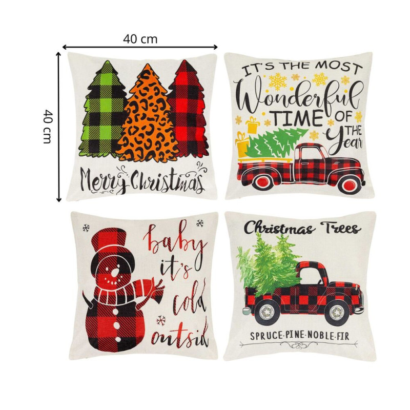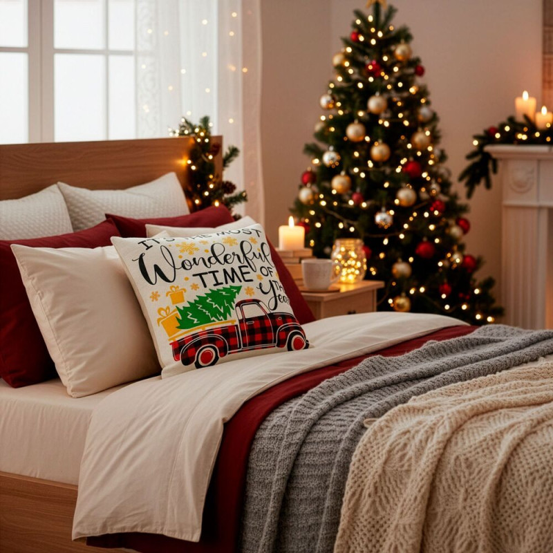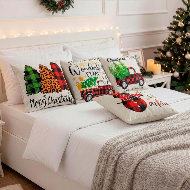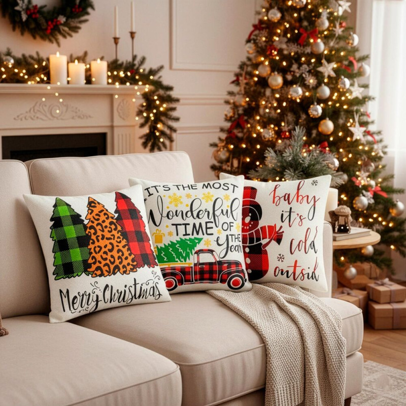 Vánoční povlaky na polštářky v krásných sezónních barvách dodají domovu hřejivou atmosféru zimních svátků. Motivy vánočních stromků, sněhuláka či tradičního červeného autíčka vytvářejí veselý a útulný vzhled, který se hodí do každého interiéru. Povlaky jsou vyrobené z kvalitního 100% polyesteru, který je měkký, odolný a snadno se udržuje, takže jsou ideální pro celodenní používání během celé sezóny. Výrazné vánoční motivy okamžitě rozzáří místnost a přinesou do domova sváteční kouzlo.
