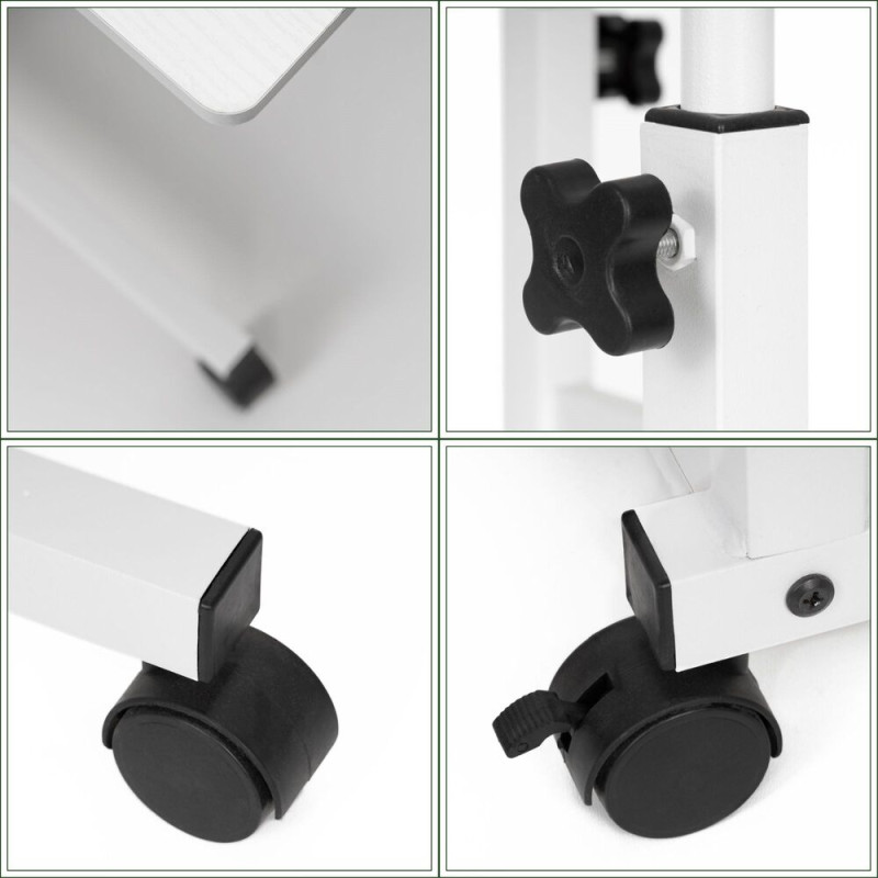 Hlavní výhodou jsou otočná kolečka s aretací, která umožňují snadné přesouvání a zároveň bezpečné zastavení na místě. Výškově nastavitelné provedení v rozmezí 76–86 cm poskytuje flexibilitu přizpůsobení podle potřeby — při práci, prezentaci i pohodlném odložení věcí vedle pohovky či postele. Výrazná úspora času bez montáže, mobilita a možnost okamžité změny umístění z něj dělají ideální řešení zejména do menších i multifunkčních prostor, kde záleží na každém centimetru.