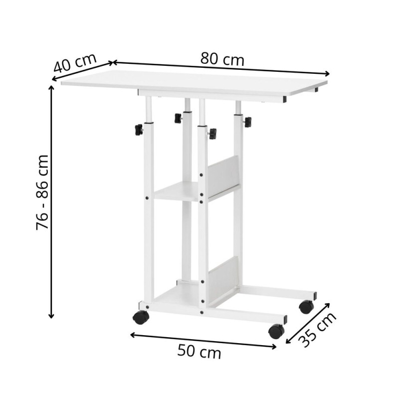Mobilní stůl na kolečkách s výškovým nastavením 76–86 cm, který snadno přizpůsobíte každé situaci. Stolek je ideální do pracovny, ložnice nebo obýváku. Výborný jako pc, konferenční či odkládací stolek. Díky kolečkům s aretací se snadno přemísťuje a bezpečně stojí na místě. Dvě spodní police poskytují další úložný prostor. Odolná MDF deska a stabilní kovová konstrukce zajišťuje pevnost. Šířka 80 cm, hloubka 40 cm, nastavitelná výška 76 až 86 cm. Nosnost 20 kg.