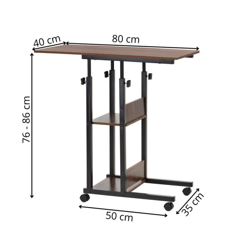Mobilní stůl na kolečkách s výškovým nastavením 76–86 cm, který snadno přizpůsobíte každé situaci. Stolek je ideální do pracovny, ložnice nebo obýváku. Výborný jako pc, konferenční či odkládací stolek. Díky kolečkům s aretací se snadno přemísťuje a bezpečně stojí na místě. Dvě spodní police poskytují další úložný prostor. Odolná MDF deska a stabilní kovová konstrukce zajišťuje pevnost. Šířka 80 cm, hloubka 40 cm, nastavitelná výška 76 až 86 cm. Nosnost 20 kg.
