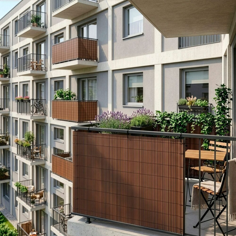 PVC zástěna 120x500 cm na balkon plot SPRINGOS GA0248 hnědá je praktické a elegantní řešení pro oddělení prostoru na balkoně, terase nebo u plotu. Díky dekoru umělého bambusu působí velmi esteticky a zároveň poskytuje účinnou ochranu před zraky sousedů. Pevně přiléhající lamely pomáhají vytvořit více soukromí a příjemnější prostředí pro každodenní odpočinek.