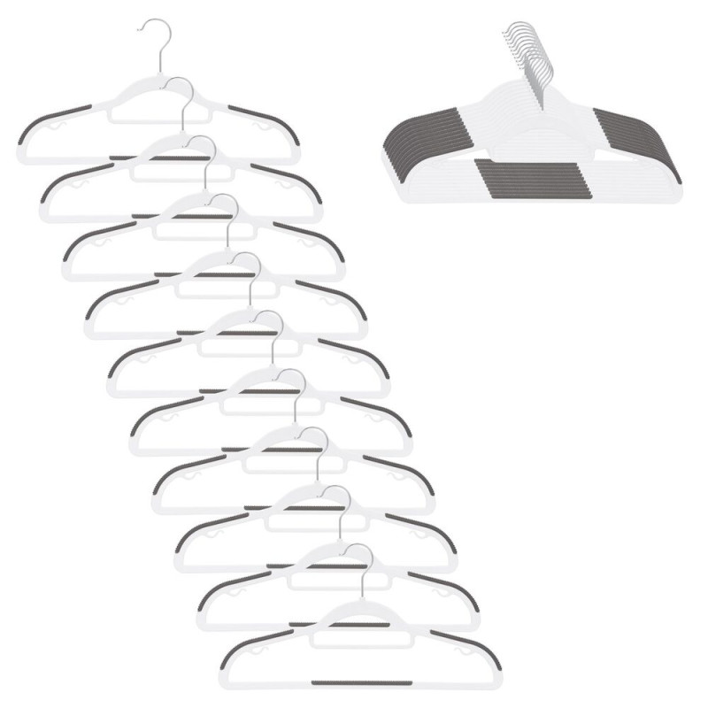 Praktická sada 20 kusů šatních ramínek s protiskluzovým povrchem zajistí bezpečné zavěšení oblečení. Lehká a pevná PE konstrukce unese až 5 kg, otočný 360° hák usnadňuje manipulaci. Ramínka na šaty mají vroubkovaná ramena i příčku proti sklouzávání, dva malé háčky slouží na doplňky. Ideální pro přehlednou organizaci šatníku.