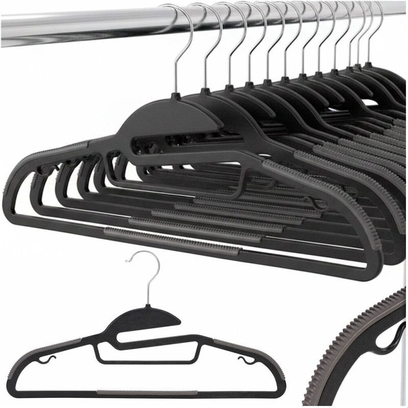 Elegantní sada 30 kusů ramínek v černé barvě pomůže udržet šatník přehledný a organizovaný. Otočný 360° hák usnadňuje manipulaci, protiskluzové povrchy na ramenou i spodní příčce zabraňují sklouzávání oblečení. Zjednodušený tvar šetří místo a dva malé háčky umožňují zavěšení doplňků či oděvů s poutky. Vhodné pro košile, šaty, kalhoty i další oděvy.