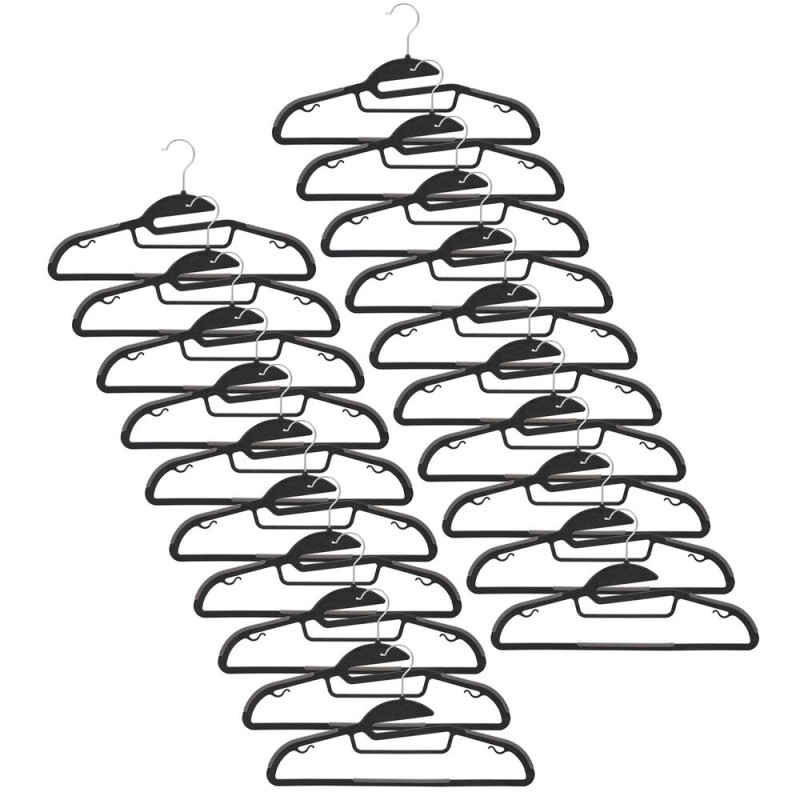 Praktická sada 20 kusů šatních ramínek v elegantní černé barvě zajistí přehledné uspořádání šatníku. Otočný hák 360° umožňuje pohodlné zavěšení i manipulaci, protiskluzová ramena a spodní příčka zabrání sklouzávání oděvů. Úzký tvar šetří místo a dva malé háčky slouží k uchycení doplňků nebo oblečení s poutky. Ramínka na šaty jsou vhodná pro košile, šaty, kalhoty i další oděvy.