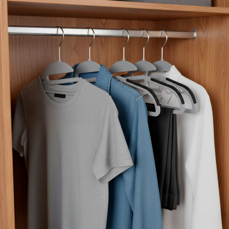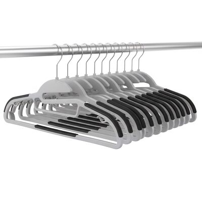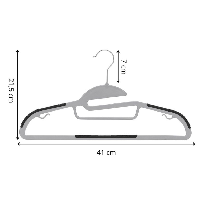Praktická sada 30 kusů ramínek v moderní šedé barvě pomůže udržet šatník přehledný a organizovaný. Otočný 360° hák usnadňuje manipulaci, protiskluzové plochy na ramenou i spodní příčce brání sklouzávání oblečení. Zjednodušený tvar šetří místo a dva malé háčky umožňují zavěšení doplňků či oděvů s poutky. Ideální pro košile, šaty, kalhoty i další oděvy.
