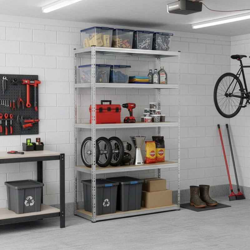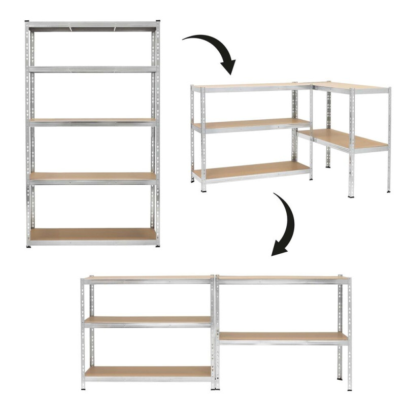 Kovový regál pro sklep, garáž i dílnu, ideální na přehledné uložení těžkých a objemnějších věcí. Vysoká, prostorná a stabilní konstrukce. 5 silných MDF polic a 3× vyztužení. Nosnost 200 kg na polici, celkem až 1000 kg. Pozinkované provedení odolné proti korozi, plastové patky. Rychlá montáž, možnost sestavení na 2 regály nebo dílenský stůl.
