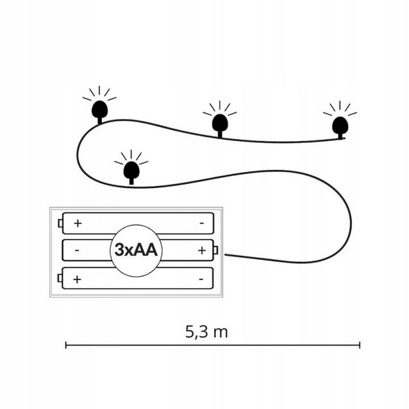 LED světelný řetěz s 8 světelnými funkcemi a napájením na baterie. Úsporné mikro diody, časovač, vnitřní i venkovní použití. Voděodolné provedení, krytí IP44. Délka světelné části 5 m, napájecí kabel 30 cm. Barva multicolor + teplá bílá, 50 led, napájení 3x AA baterie.