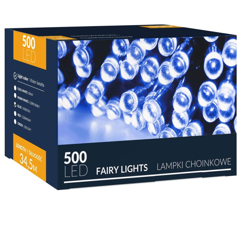 LED světelný řetěz pro vánoční osvětlení. 8 světelných funkcí vč. funkce záblesky, ultra úsporné mikro diody, vnitřní použití, certifikace CE, RoHs, IP20. Délka světelné části 33 m, napájecí kabel 1,5 m. Barva modrá, 500 LED.