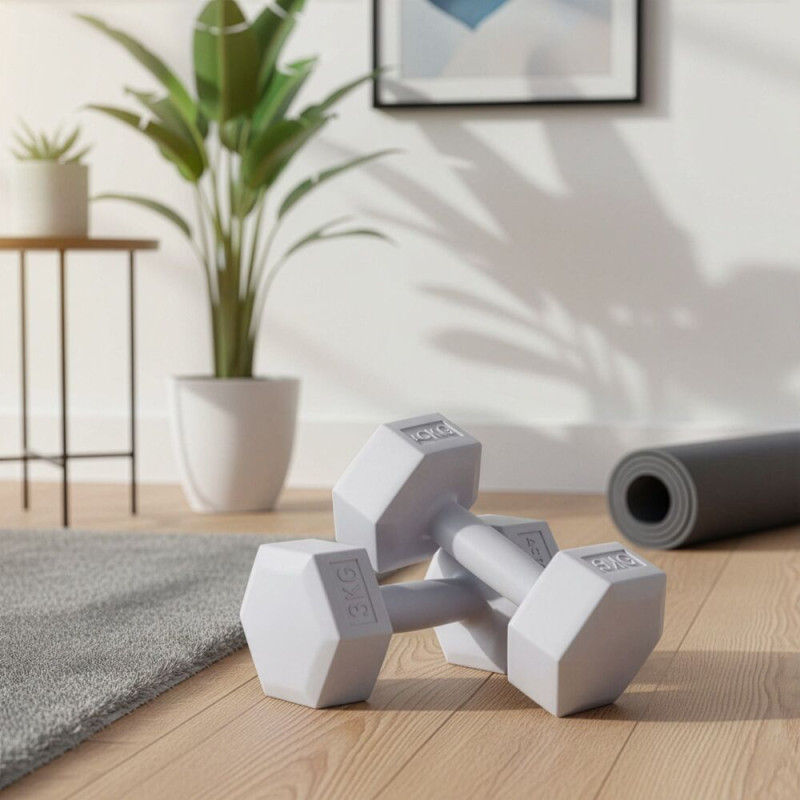 Sada dvou jednoručních činek o hmotnosti 2x3 kg ideální pro silový i kondiční trénink doma i ve fitness. Šestiúhelníkový tvar zabraňuje kutálení a zajišťuje stabilitu při odložení. Ergonomická rukojeť poskytuje pevný a pohodlný úchop. Kvalitní kompozitní materiál garantuje dlouhou životnost.