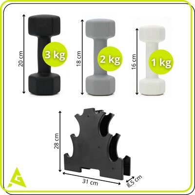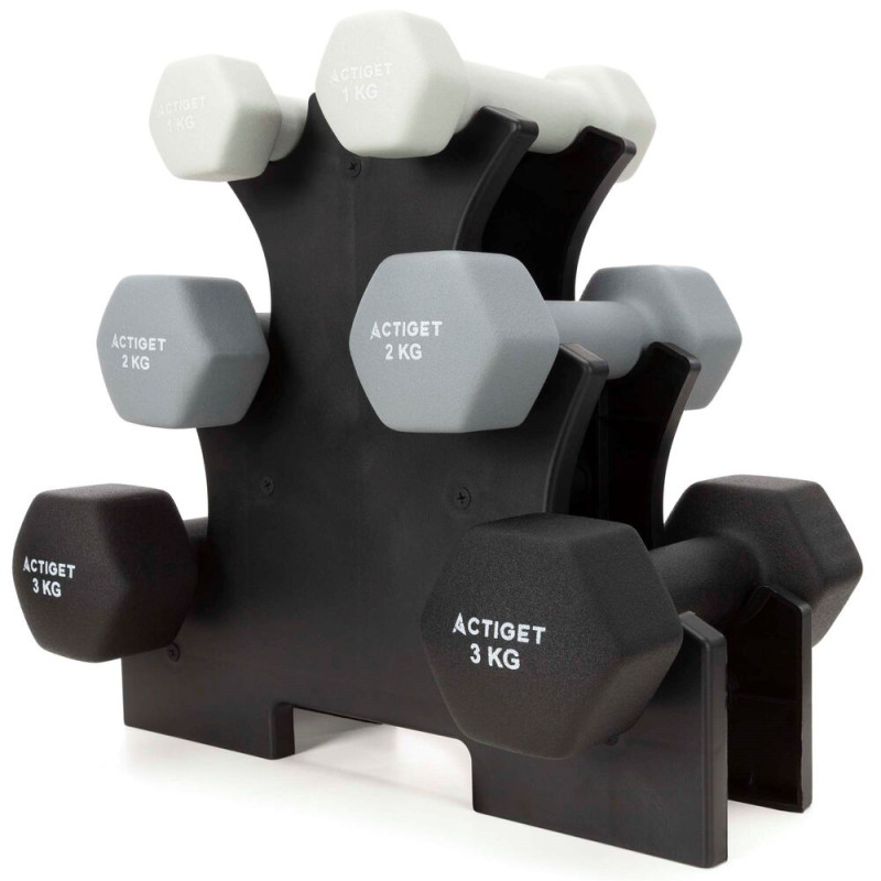 Kompletní sada 6 jednoručních činek se stojanem o celkové hmotnosti 12 kg nabízí vše pro domácí trénink. Kombinace hmotností 1, 2 a 3 kg je ideální pro rozcvičení, kondiční trénink i posilování. Litinové jádro s neoprenovým povrchem má příjemný a protiskluzový úchop. Šestihranný tvar brání kutálení a pevný PVC stojan udržuje činky přehledně uložené.