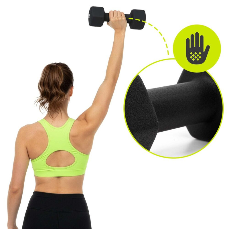 Činky jsou opatřeny neoprenovým, protiskluzovým povrchem, který poskytuje pohodlný a jistý úchop i při intenzivnějším tréninku. Ergonomický šestihranný tvar proti kutálení zvyšuje bezpečnost při odložení. Součástí sady je odolný PVC stojan pro přehledné uložení, díky kterému budou činky vždy na svém místě a váš tréninkový prostor zůstane organizovaný.