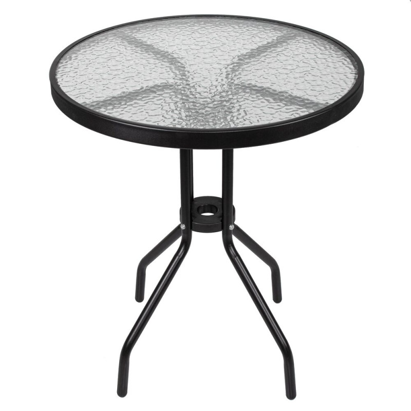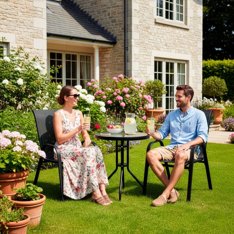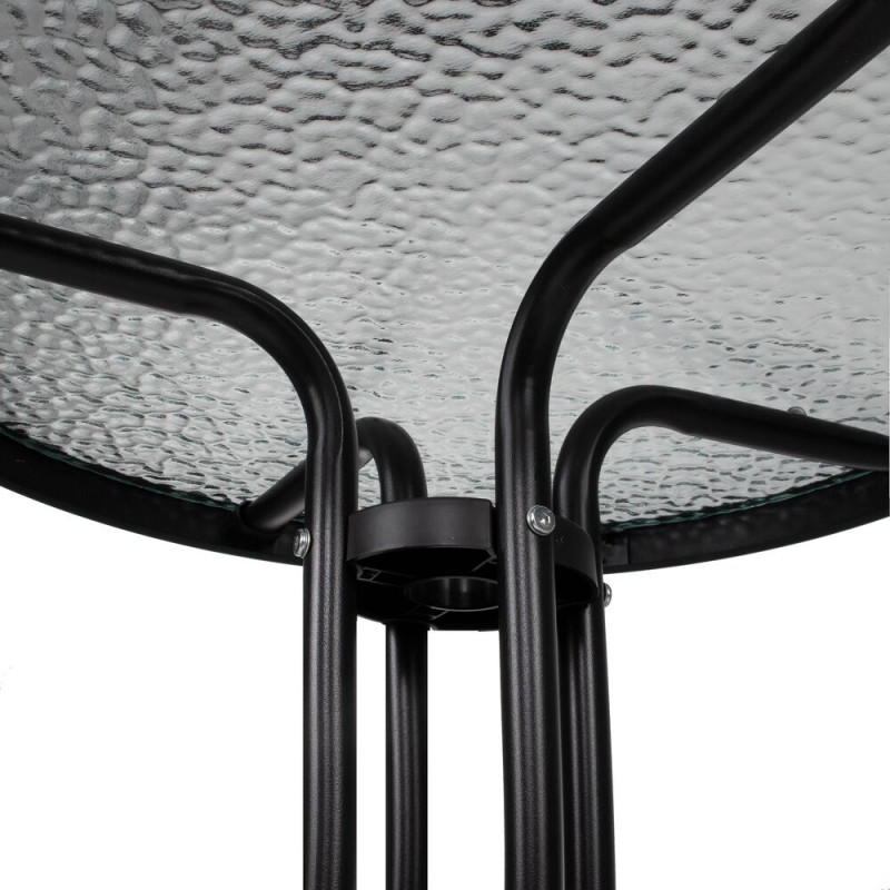 Součástí setu je stůl s deskou z tvrzeného skla o tloušťce 5 mm, která je pevná a snadno se udržuje. Sedací část je vyrobena z odolného a prodyšného textilenu, který poskytuje komfort i během horkých dnů. Materiály jsou navrženy pro celoroční venkovní využití.