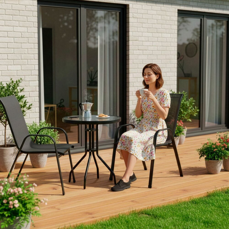 Stylový set obsahuje 2x zahradní křeslo a stůl se skleněnou deskou z bezpečnostního skla. Zahradní set nábytku pro pohodlné posezení venku. Slouží k relaxaci na terase, balkoně nebo zahradě. Vytváří příjemné místo pro odpočinek i setkání s rodinou a přáteli. Moderní a praktické řešení pro venkovní prostor.