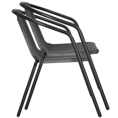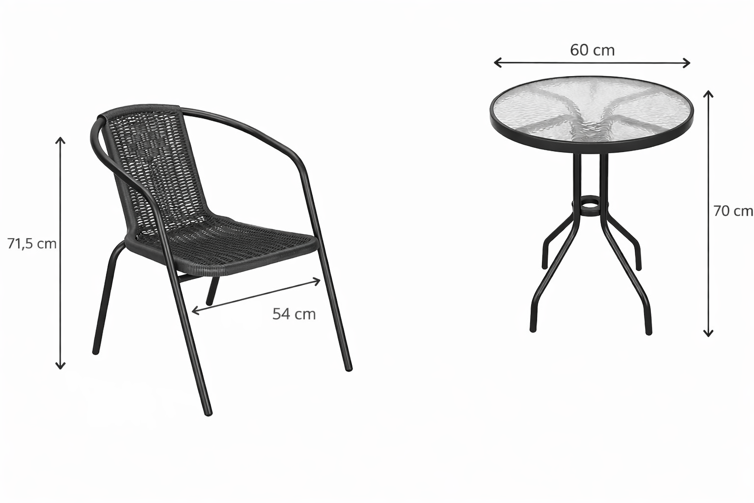 Stylový set obsahuje 2x zahradní křeslo a stůl se skleněnou deskou z bezpečnostního skla. Odolná kovová konstrukce a plastový výplet imitující ratan zajišťují dlouhou životnost. Pohodlné, vysoce prodyšné židle s opěrkou na ruce jsou stohovatelné a odolné vůči vodě i počasí. Ideální jako balkonový, terasový nebo zahradní nábytek. Nosnost židle 120 kg, průměr stolu 60 cm, nosnost stolu 60 kg.