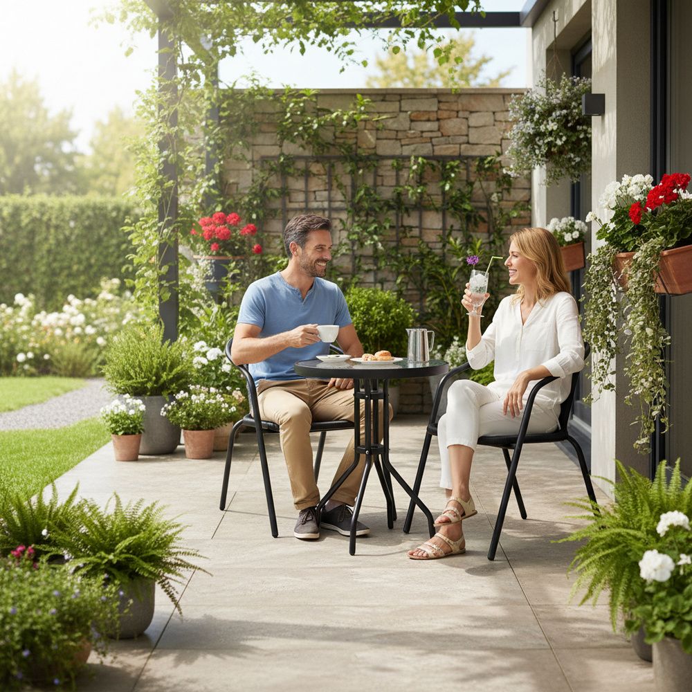 Zahradní set SPRINGOS BISTRO 2 je navržen tak, aby vydržel i náročnější venkovní podmínky – je odolný vůči vodě a dalším povětrnostním vlivům, což z něj činí ideální volbu pro celoroční použití. Stohovatelné židle umožňují jednoduché uskladnění, což oceníte zejména mimo sezónu. Tento elegantní set dokonale propojuje funkčnost s moderním designem.